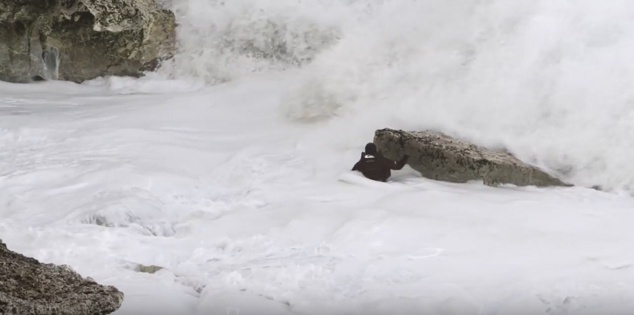 ナザレをはじめ、マーヴェリックスなど世界中の危険なビッグウェイブを攻める世界的ビッグウェイブ・サーファーRoss Clark Jonesが、クリーンなコンディションに恵まれたナザレでレギュラーのセットを掴みつつも、途中でワイプアウトしてしまったことが命取りとなり、インサイドの岩場に打ち上げられてしまうという最悪の事態に。