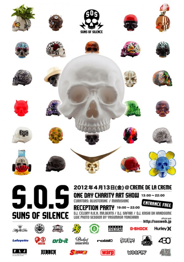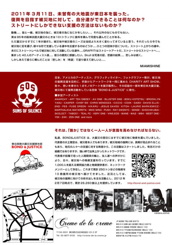 日本、アメリカのアーティスト、グラフィティライター、フォトグラファー等が、被災地の復興支援を目的に、手掛けたアートワークを一同に集めたCHARITY ART SHOW。各々、想いを乗せた1点モノ髑髏のアートを展示販売し、その収益の一部を東日本大震災後、被災地にて復興活動をしている団体“BOND & JUSTICE”に寄付!!