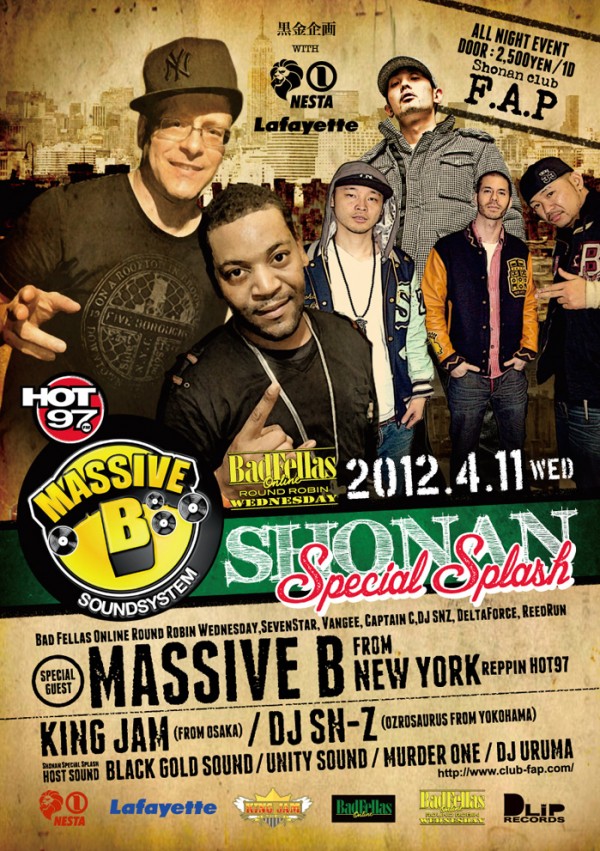 スペシャルゲストにNYからMASSIVE B を迎え、さらに今年13周年を迎えるKING JAMが来襲。DJ SN-Z from OZROSAURUSも参戦の超豪華布陣で送るまさに”SPECIAL SPLASH”!!