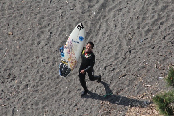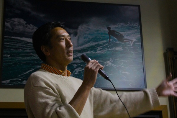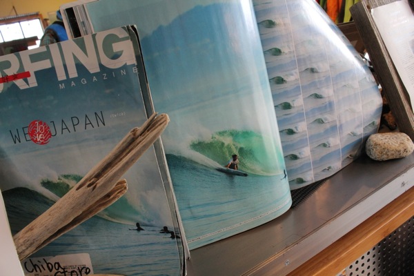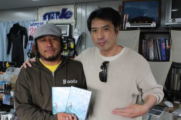 会場にたどり着くまでにどこか波乗りは出来ないかと思い、片貝海岸にあるRootsに立ち寄らせていただいた。するとオーナーであり作品中でもズバ抜けたパフォーマンスを披露している1996年JPSAグランドチャンピオンの福地孝行プロが出迎えてくださった。