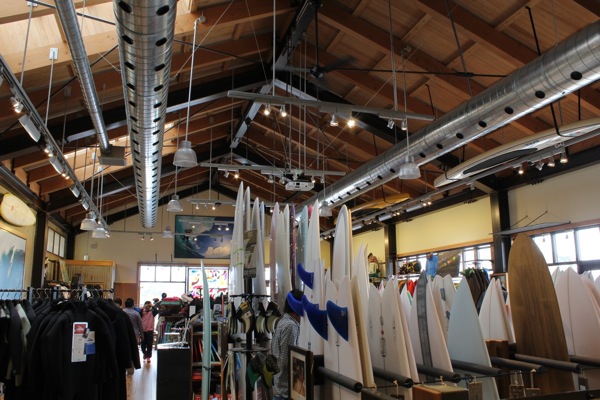 サーフ千葉ストアの広い店内にはウェアはもちろん、サーフボードやウェット、ボディーサーフィンに使うハンドプレーンなどが陳列されている。店舗の屋根の太陽光発電で得た電力を使用するなど商品以外にもpatagoniaらしさが存分に感じられる素晴らしい店舗だ。