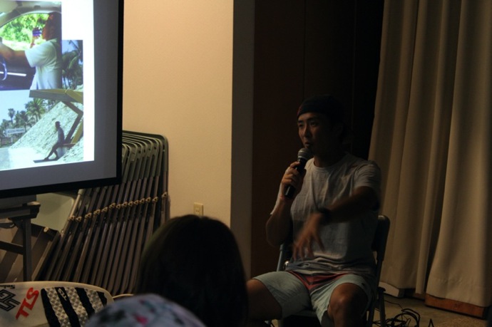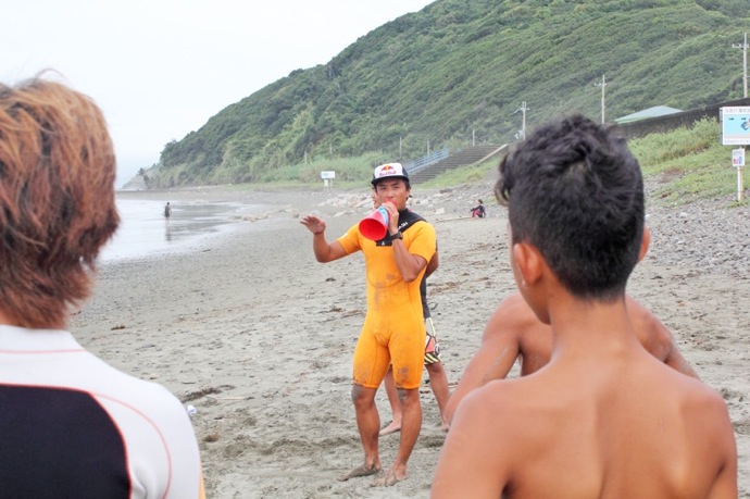 会場では磯ノ浦でサーフィンを始めたという山中海輝プロと