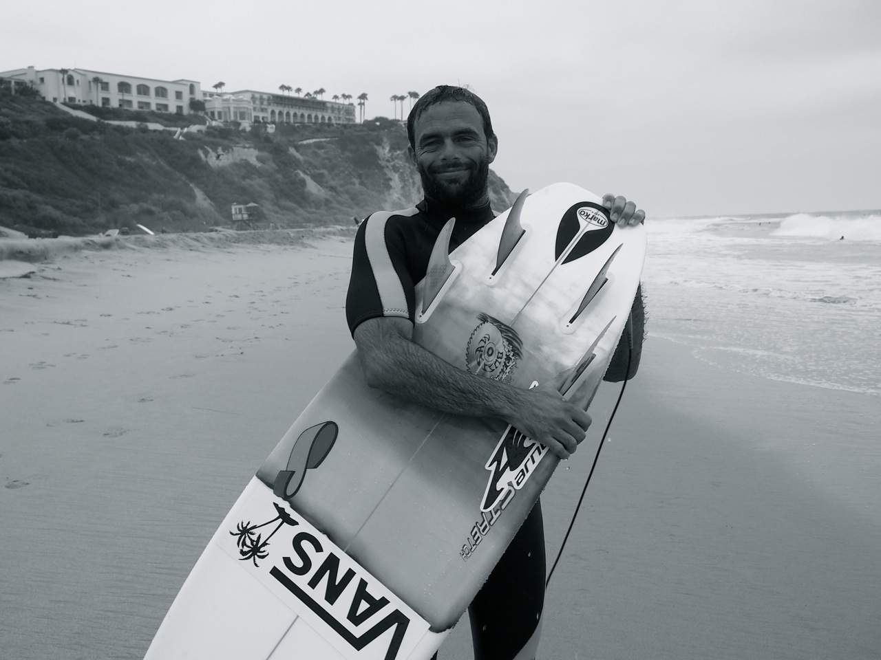 ビーチで自分の削った最新の”Chritian Fletcher Surfboard”を見ながら