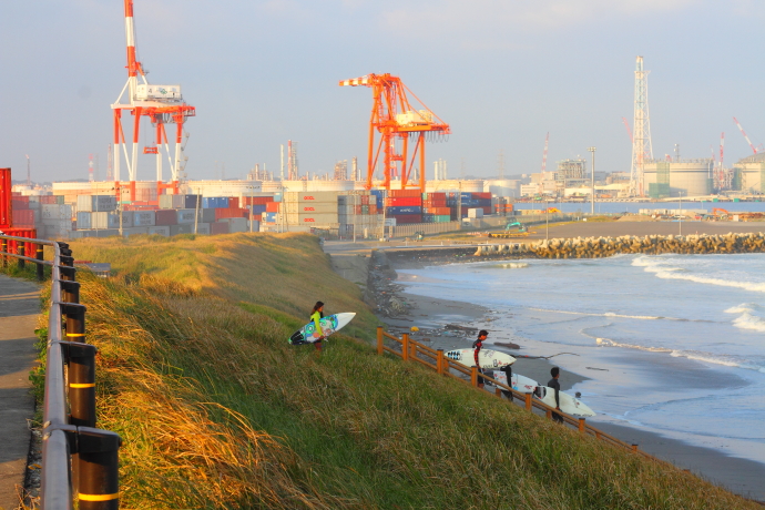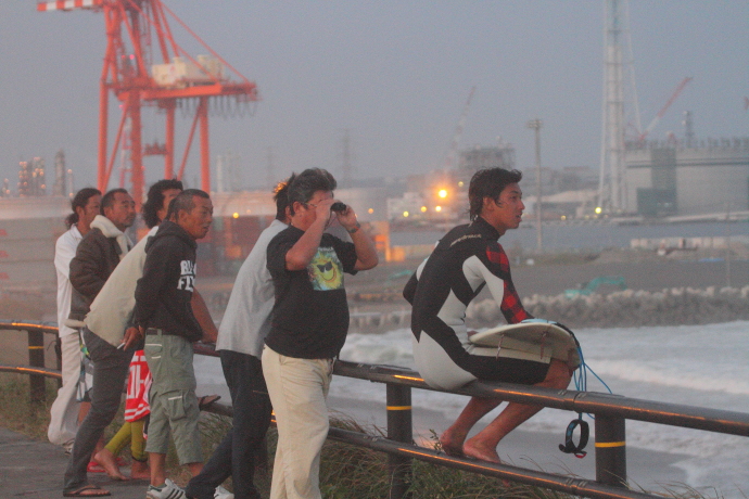 沖に波が入る度に、駐車場で高橋みなとのその姿を見守るローカルたちから