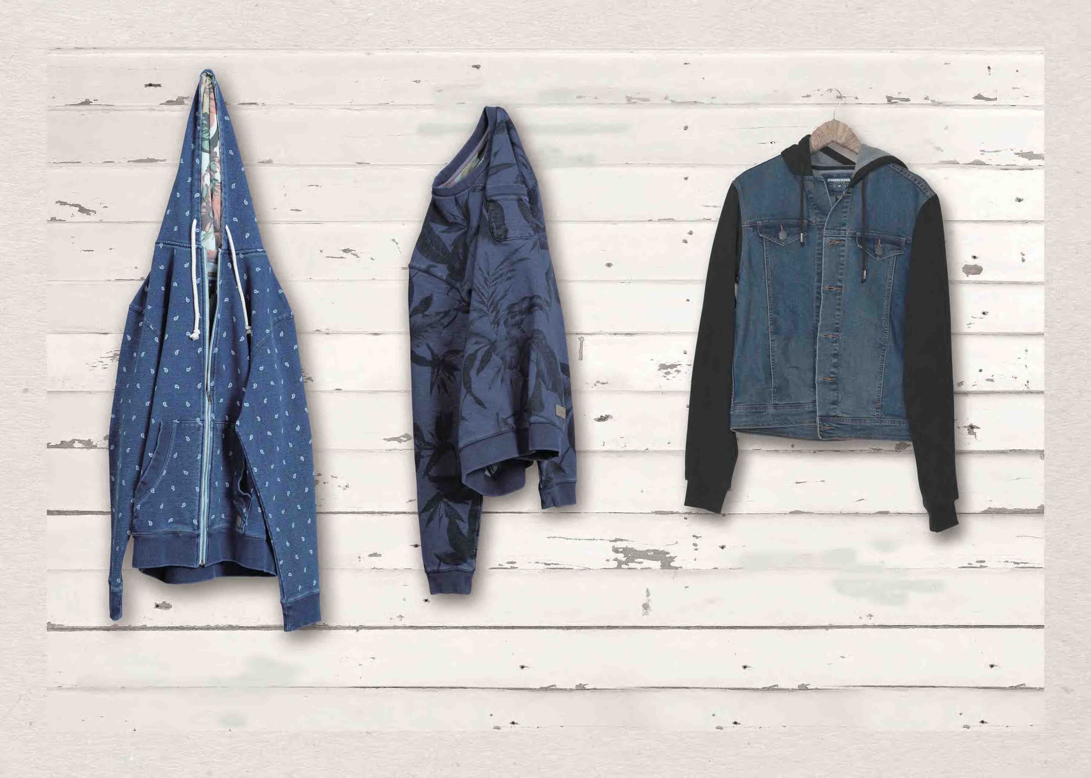 デニムやニット、ジャージ素材を鮮やかな藍色に染めたアイテムを中心に、