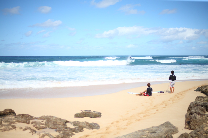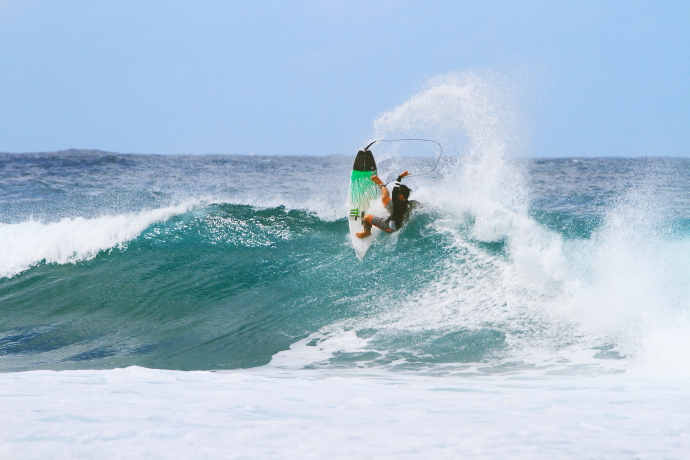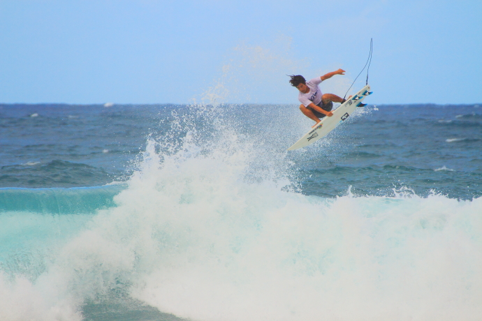 小振りなコンディションとなったこの日も岩場でサーフ。