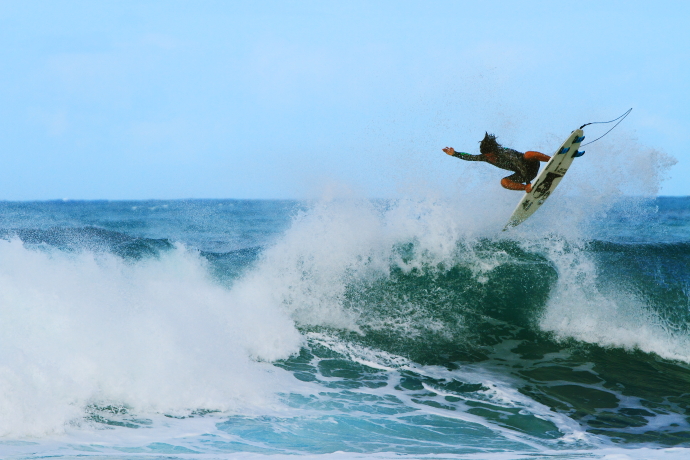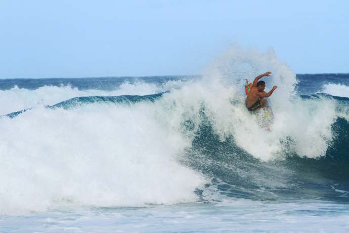 リラックスしたライディングで岩場の波をクルーズしていた。