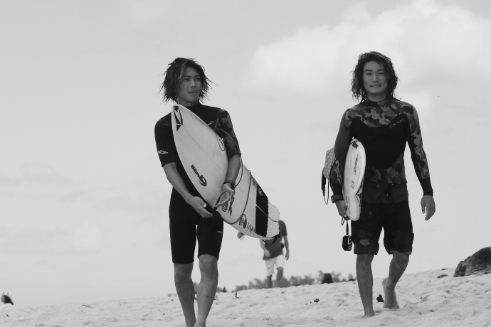 右方向のピークで波を掴む湯川正人と大原洋人。