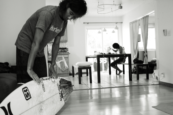 またしてもパイプの目の前にあるVOLCOM HOUSEにステイする村上舜。
