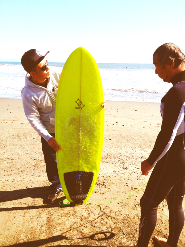 Jr.Dee checked DA single fin board shaped by Fujimura-san.