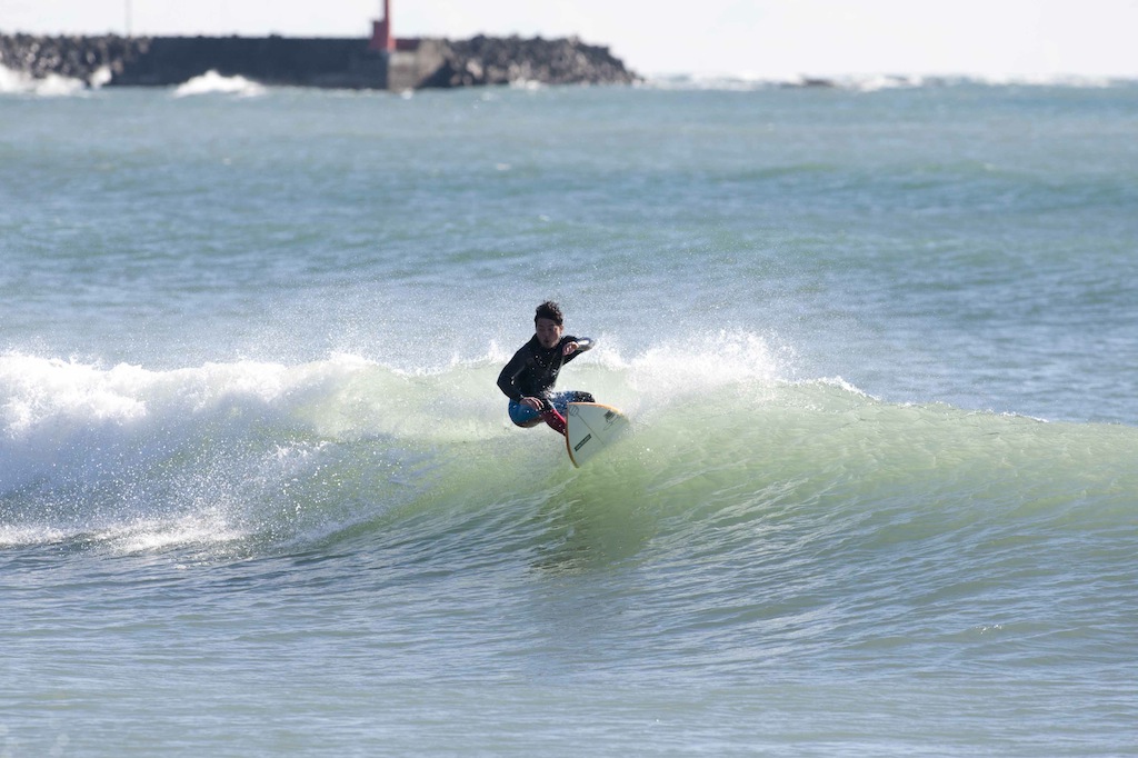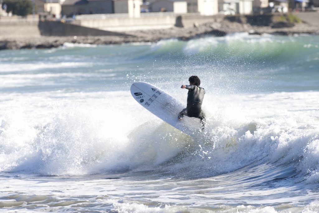 As always, local knowledge is key, and today’s patient surfer was Yoshi Ogawa. He watched the conditions, wind, and tide, then made his move. A quick session, but the best waves. His first wave lined up nicely and drew a nice long top turn then a lip line floater on the inside.