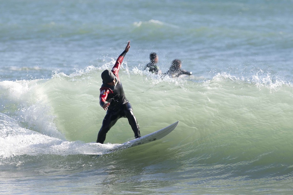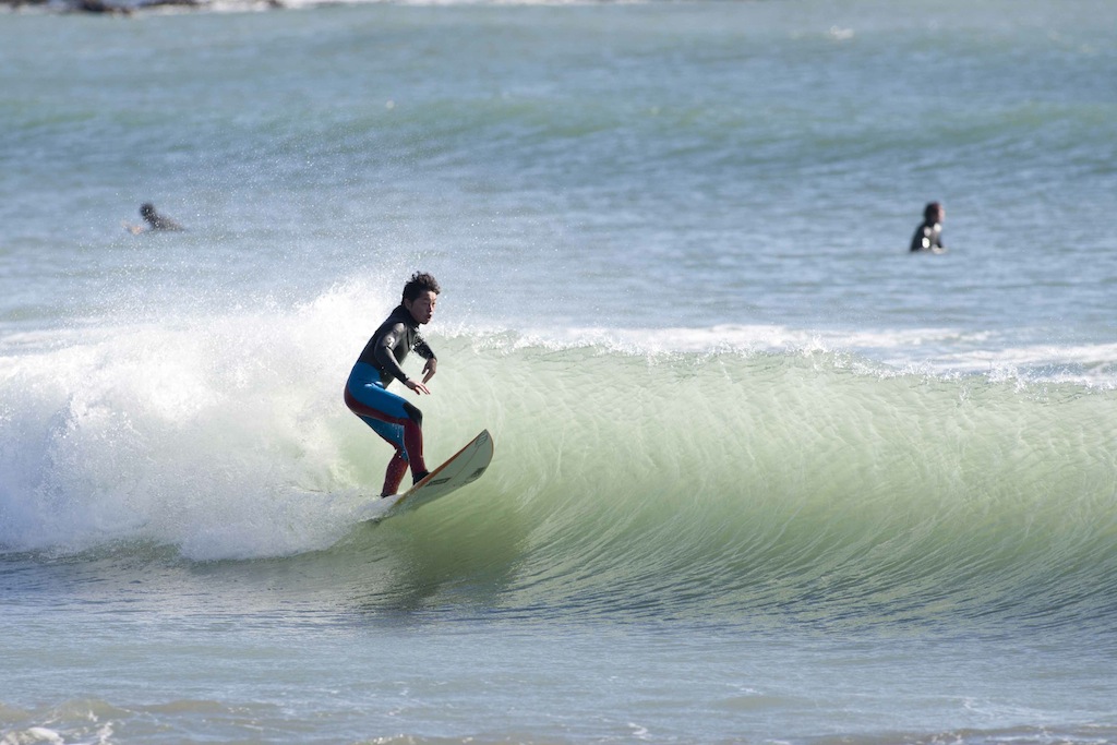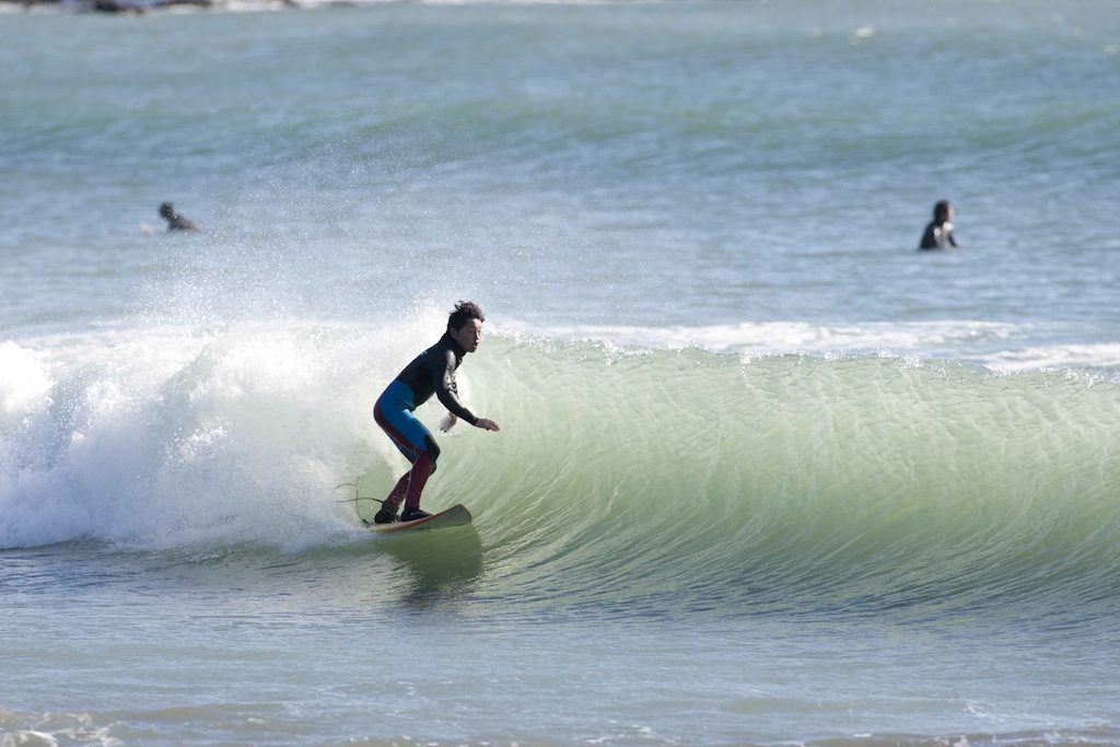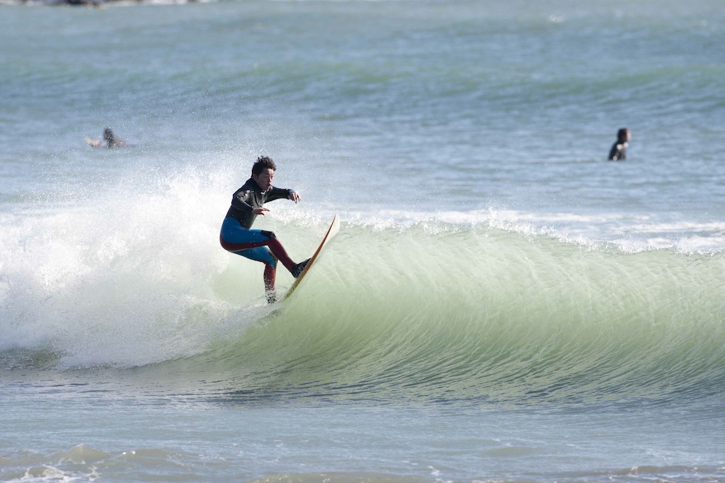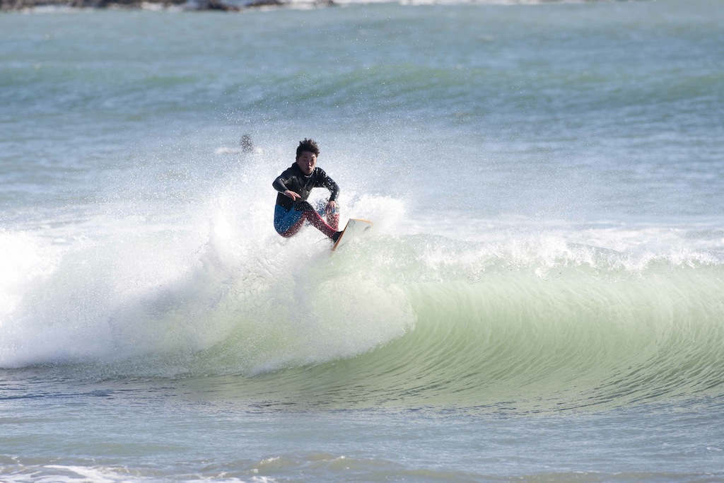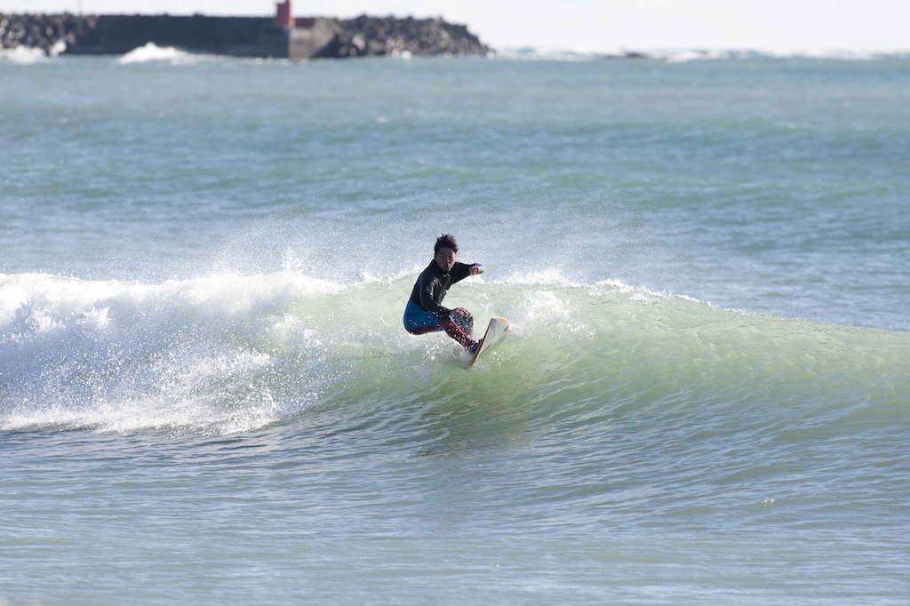 Tokko showed up a little late, but showed his stylish turns in the small windy surf.