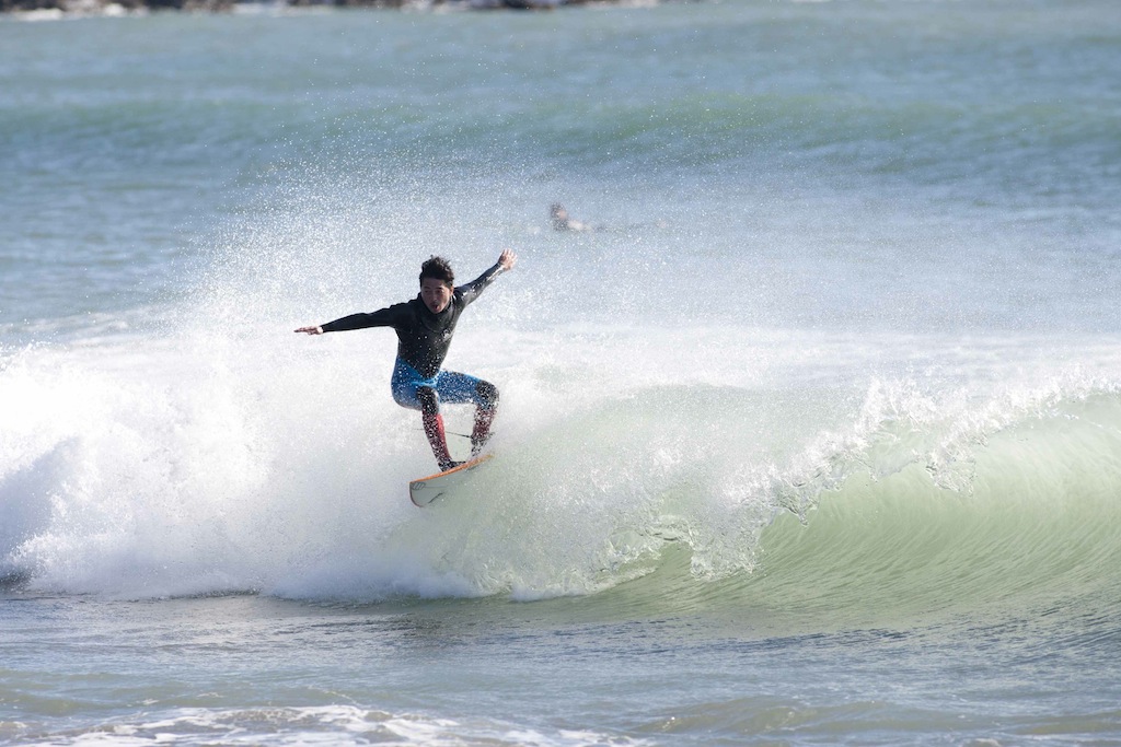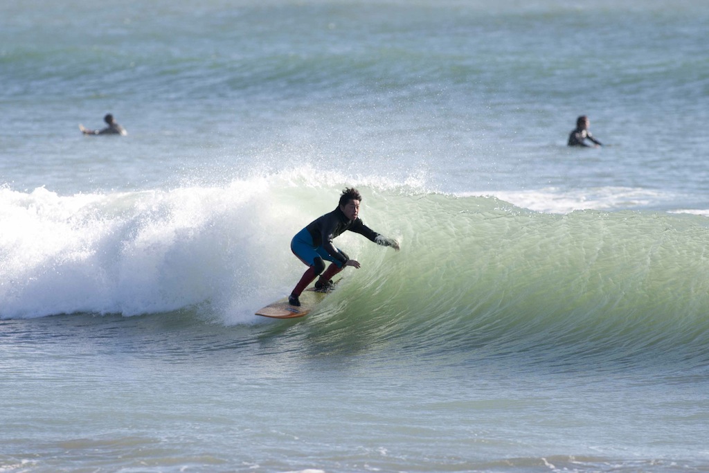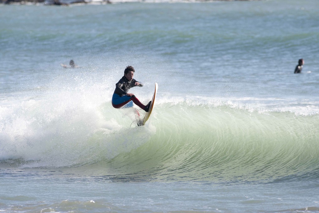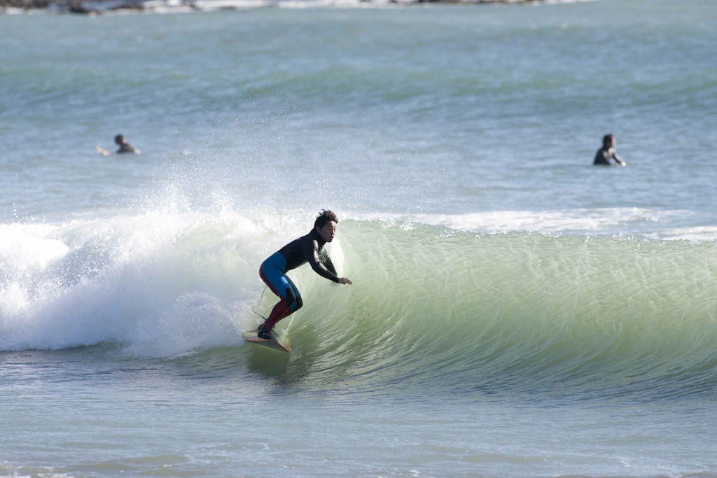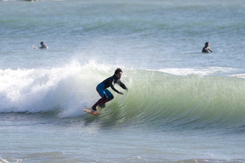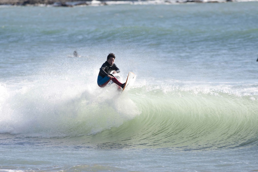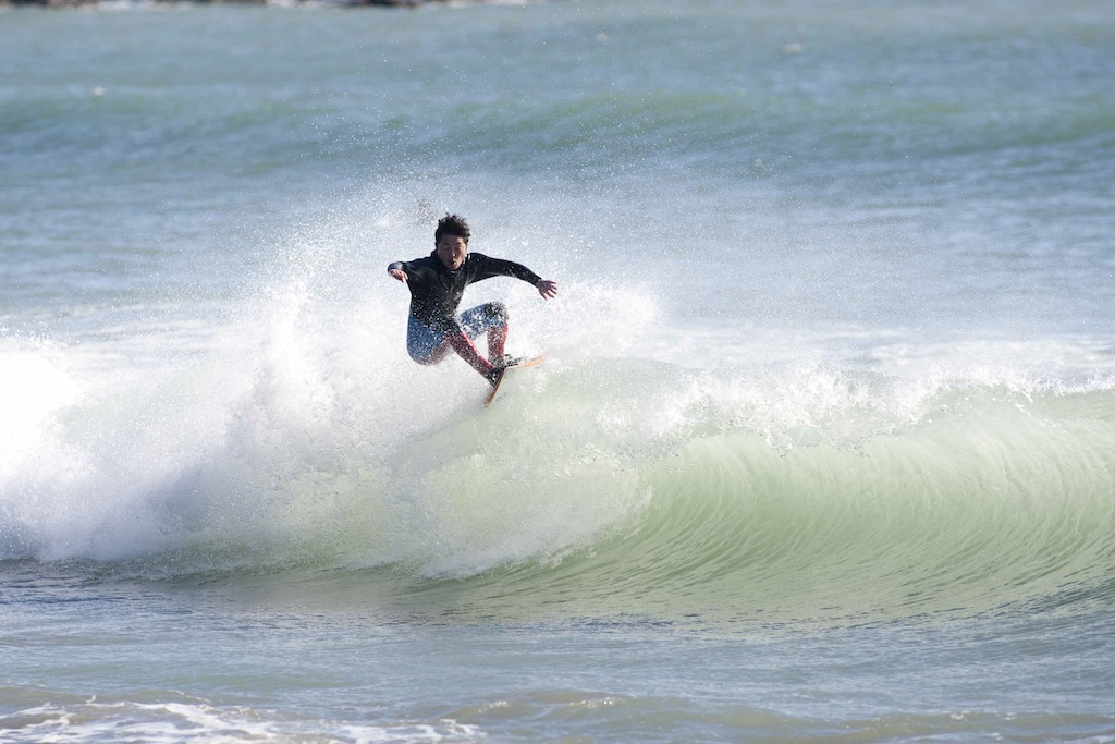 Tokko showed up a little late, but showed his stylish turns in the small windy surf.