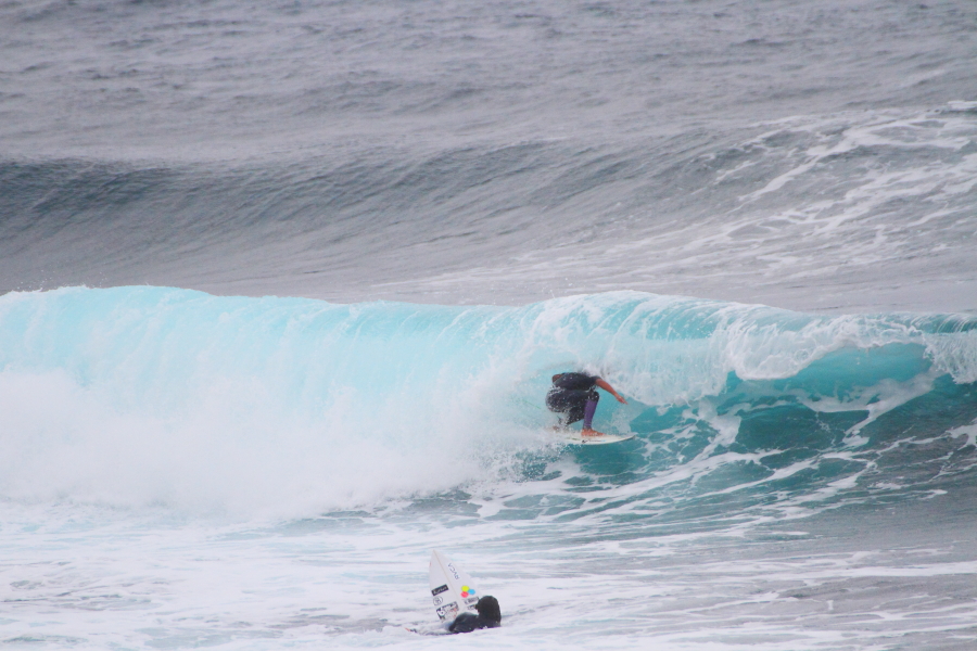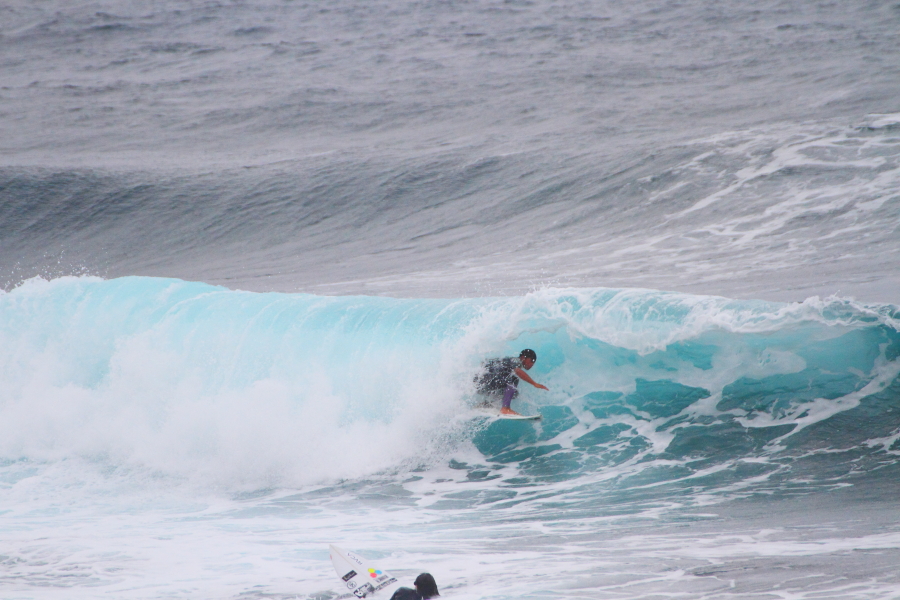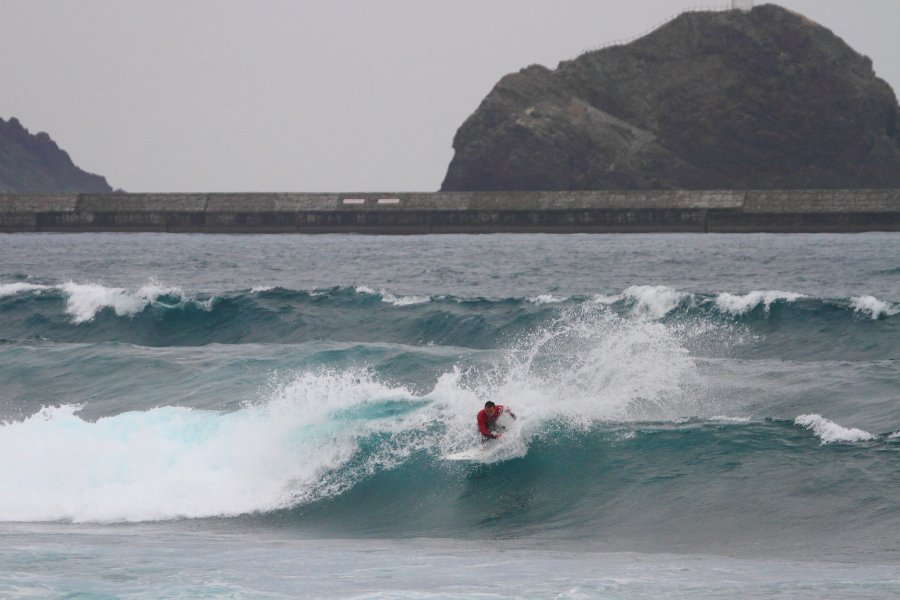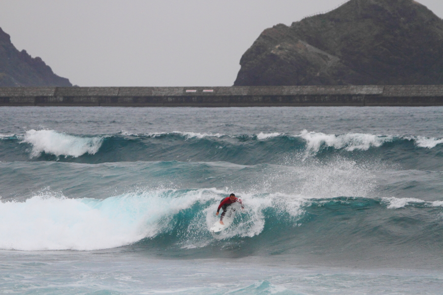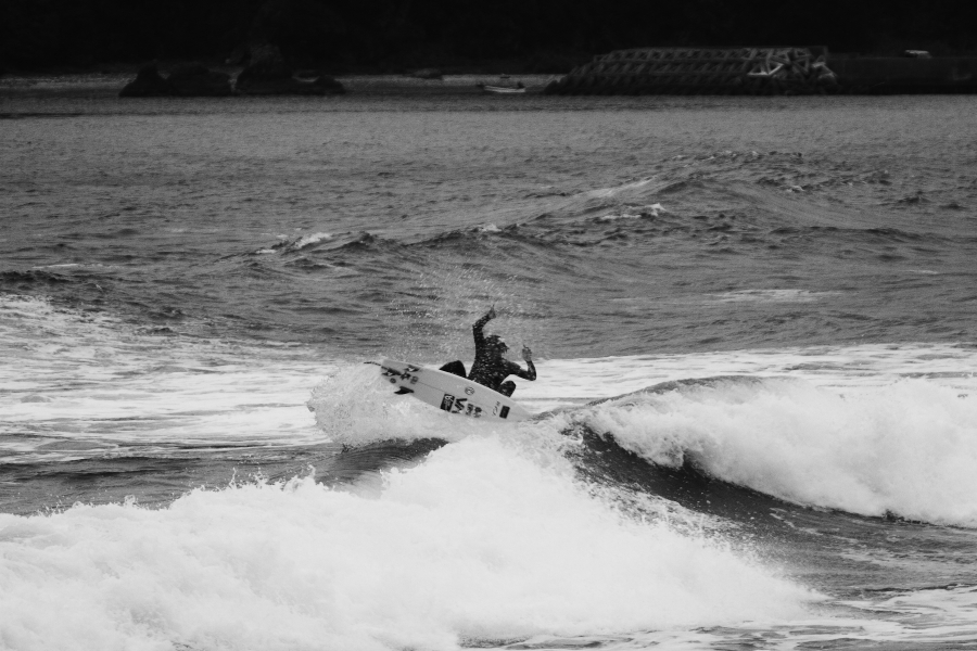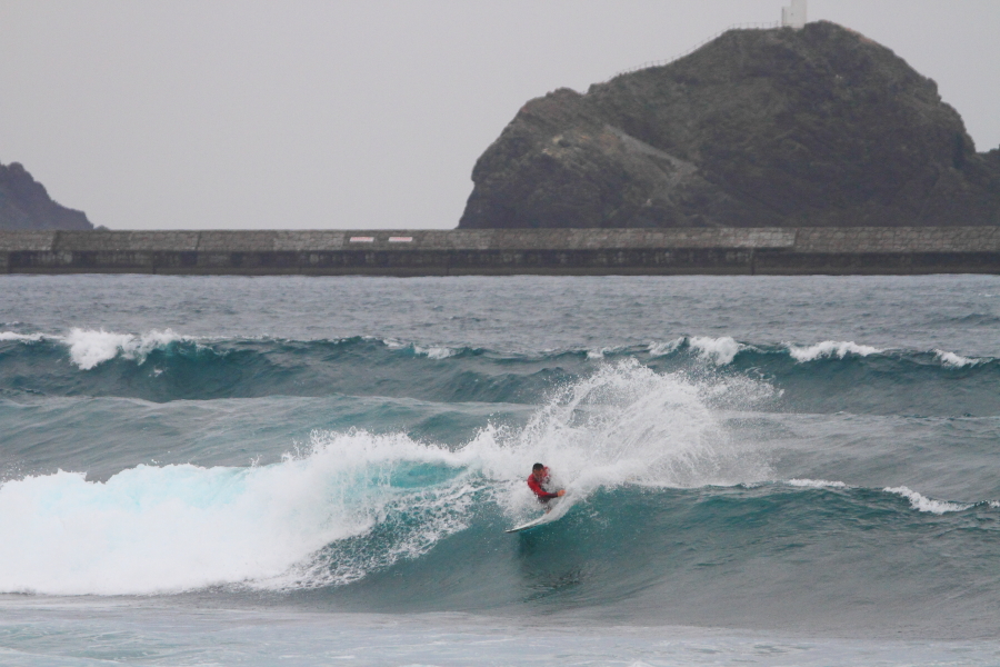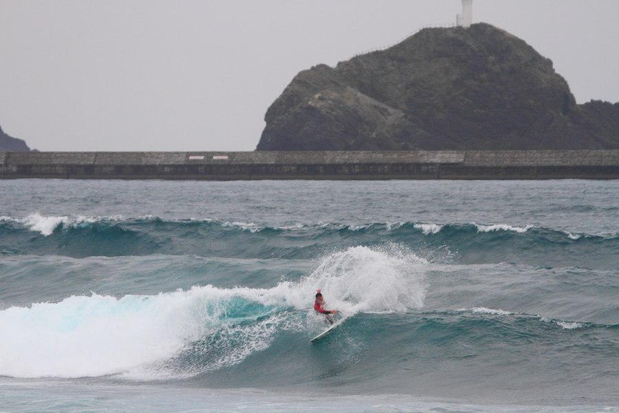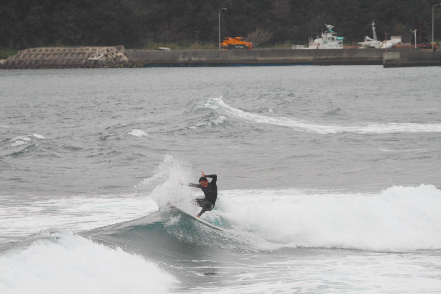 波に張り付くようなサーフィンで大きなスプレーをあげていた