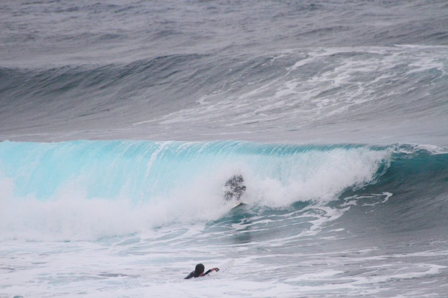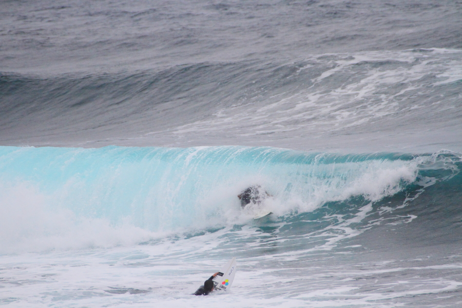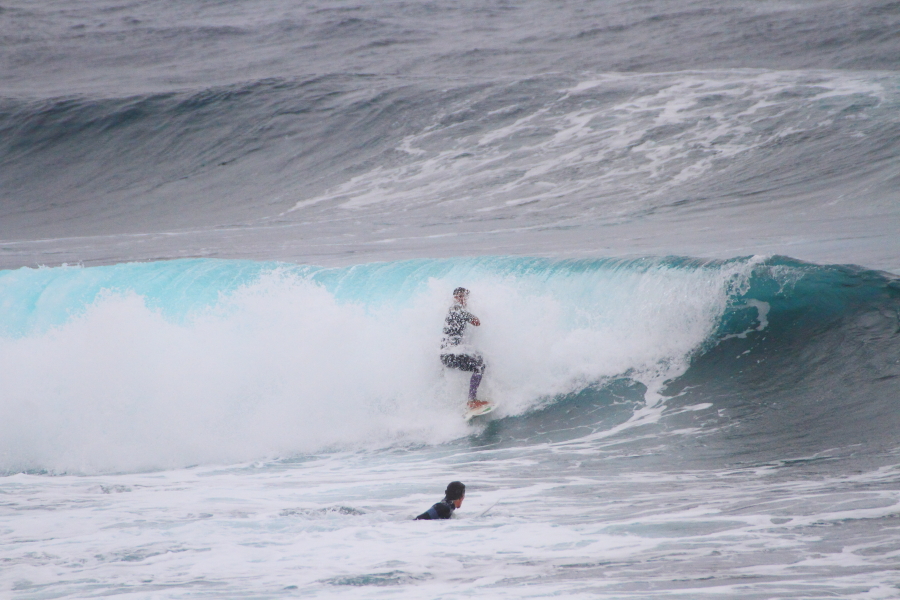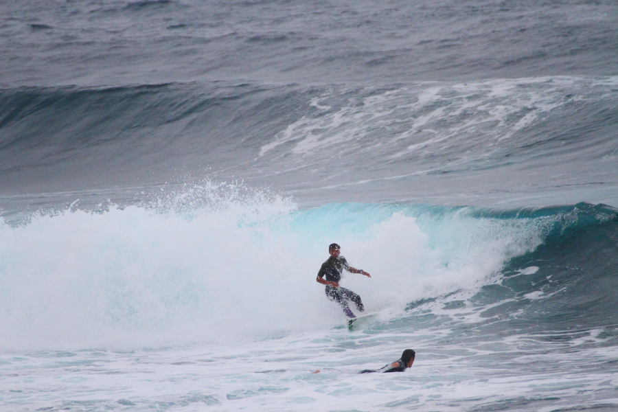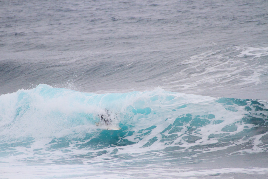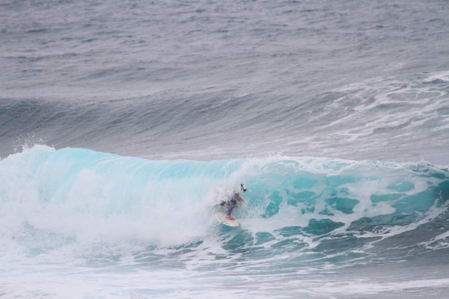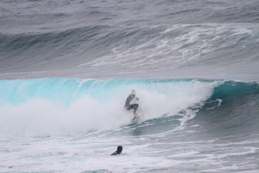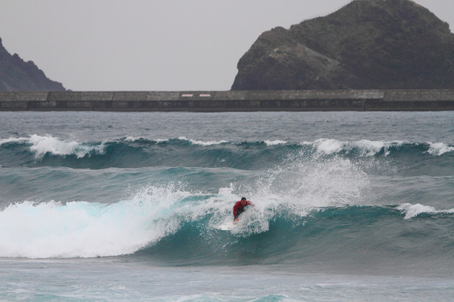 波に張り付くようなサーフィンで大きなスプレーをあげていた