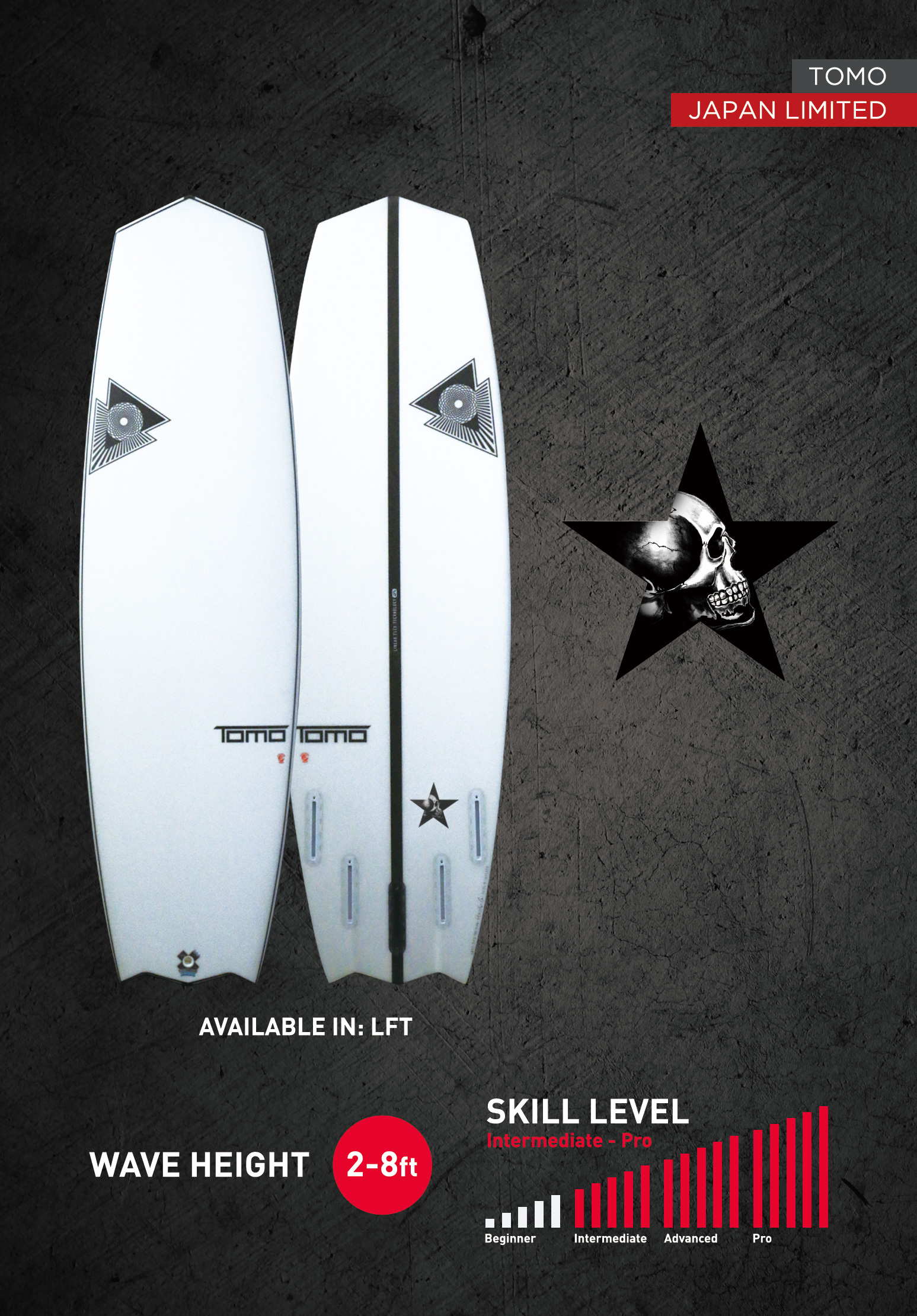 「Deathstarはサーフボードと言うより飛行機に近いピュアなスピードマシン。この未来的デザインはレーザーのような精度のターンを可能にし、超低抵抗なシェイプデザインによって今までにないスピードの加速を実現にする。日本向けのこのモデルは特に小波に合わせてチューニングされており、タイトな切り返し等の為に、幅を若干広げてアウトラインもより曲線的にしてある。独自のテール形状が、ダイレクトな反応とコントロールを伴ったシャープなターンを可能にし、Tomoのトレードマークの「ダイアモンド・ノーズ」が滑水による浮力に貢献すると共に、ノーズ部のスイング・ウェイトを減少させて積極的な方向転換も実現している。2015Deathstarの、これまでに経験した事のないスピードをぜひ体感してください。」