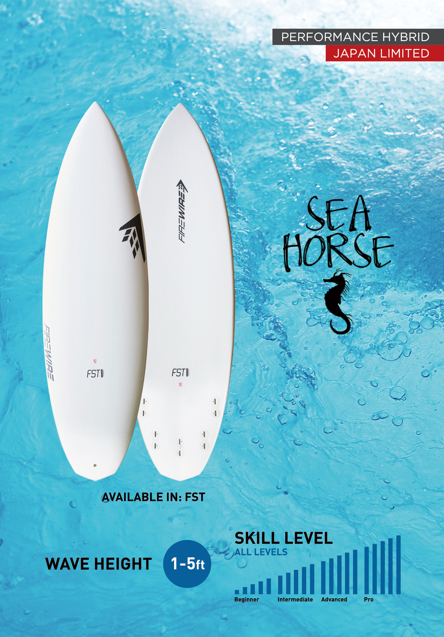 Seahorseは日本で爆発的ヒットと飛ばしているRaptorとFirewireチームライダーTimmy Reyesお気に入りのUnibrowのモデルコンセプトをミックスさせた日本限定パフォーマンスハイブリットボード。 従来のショートボードと同様にテール部分にかけレールを落とし、ラウンドテールとスカッシュテールの両テールの特徴を持つダイヤモンドテールを融合することにより、より機敏な動きを可能にし、センターからノーズにかけて若干厚めなレールは十分なスピード・パドル性を生み出した。通常乗られているショートボードよりも2~4インチほど短めのスペックをお勧め。