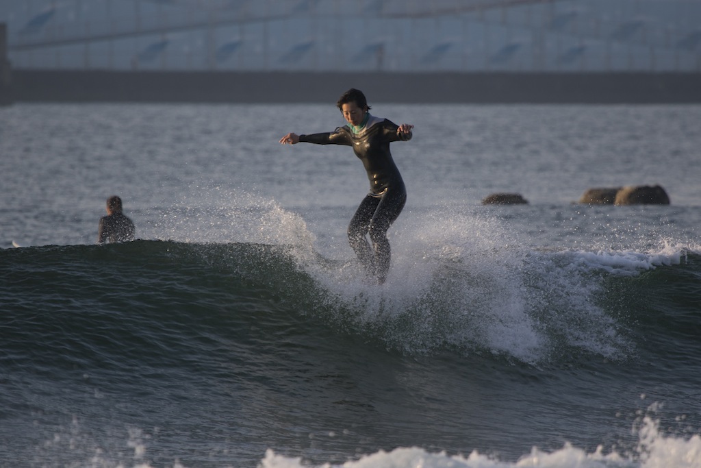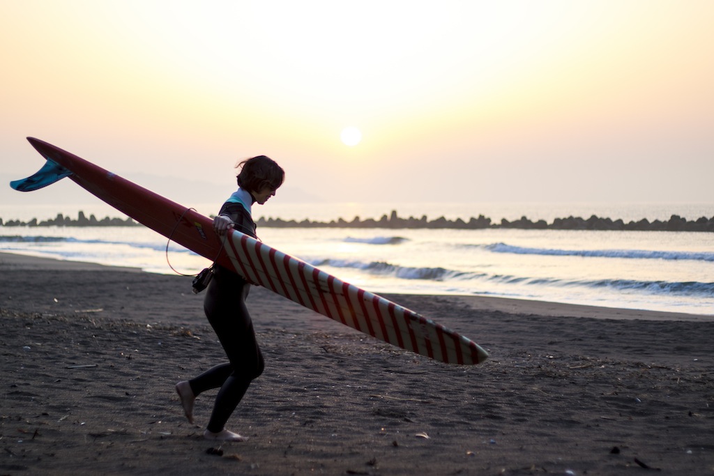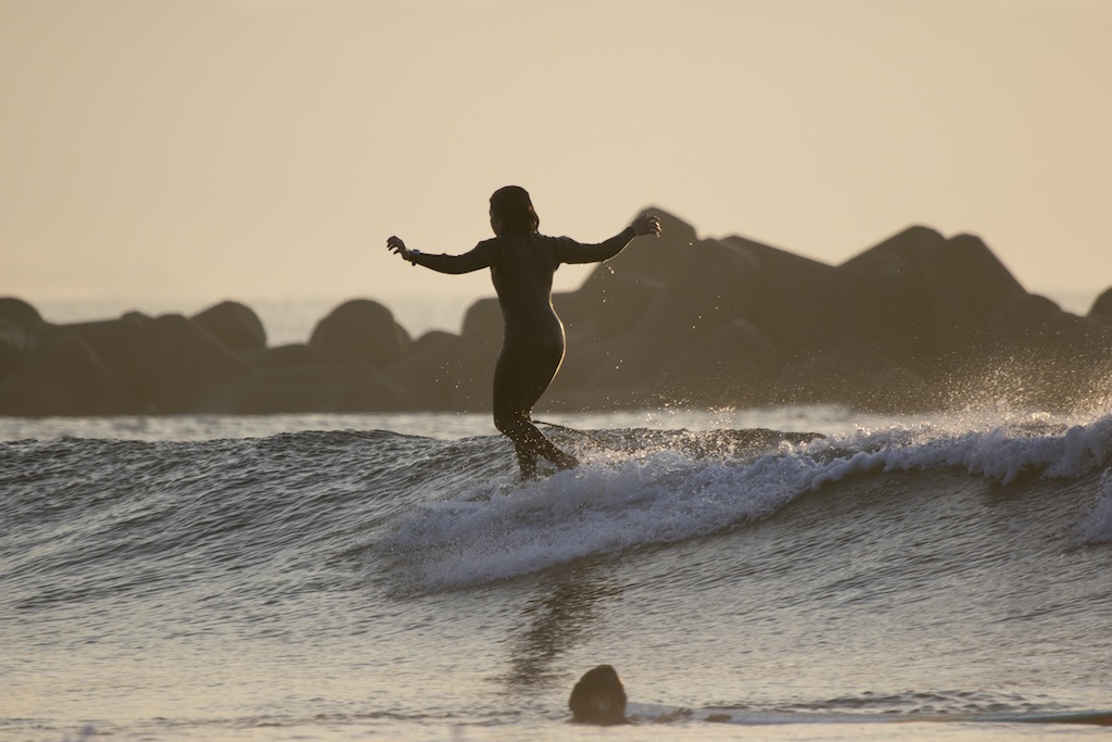 5am. Out the door to catch the sunrise. It’s been a while since I’ve been to the beach this early in the morning. Down to Seaside point and the longboard girls are out enjoying the small but clean surf. Kamogawa pro longboarder, Mizue Oguri is a regular at 5am. Rain or shine, onshore or offshore, she’s out there.