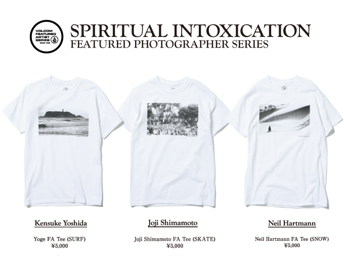 海、山、コンクリートの上、それぞれのフィールドでSpiritual Intoxication (精神的に高揚)するサーファー、スケーター、スノーボーダー達の人生の中における貴重な一瞬を捉えた、それぞ れのフィールドで活躍するフォトグラファー吉田憲右 aka YOGE、Joji Shimamoto、Niel Hartmannの3人をフィーチャーしたフォトTeeシリーズ、Spiritual Intoxication Featured Photographer Tee Seriesを来る4月10日発売を開始します。
