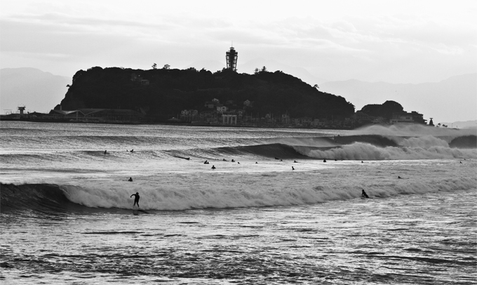 鎌倉七里ガ浜正面から撮影された『鎌倉高校前』、『峰が原』、『ロア』の3つのピークが1組のラインナップとなった奇跡的瞬間をとらえた2012年6月の台風『マーゴン』がもたらしたTHE DAY、江ノ島を望む。