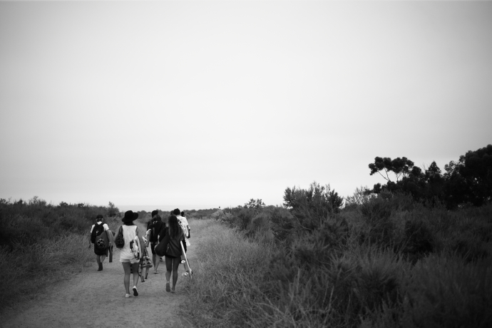 下り坂を降り、丘を歩き、アムトラックの線路を越えて