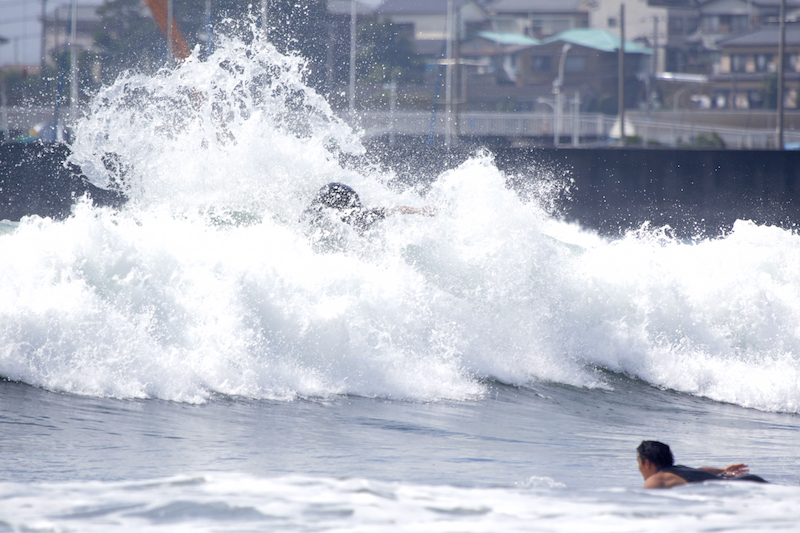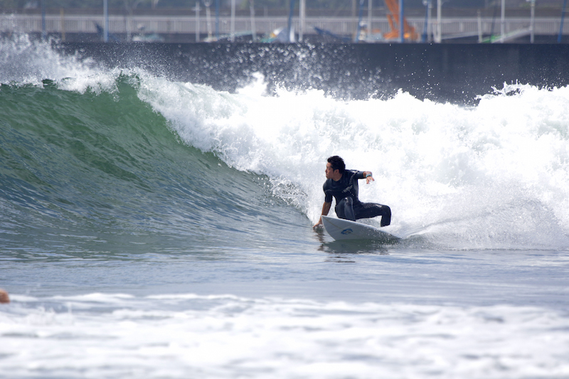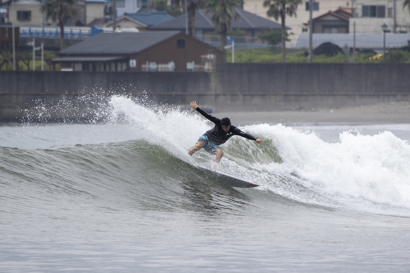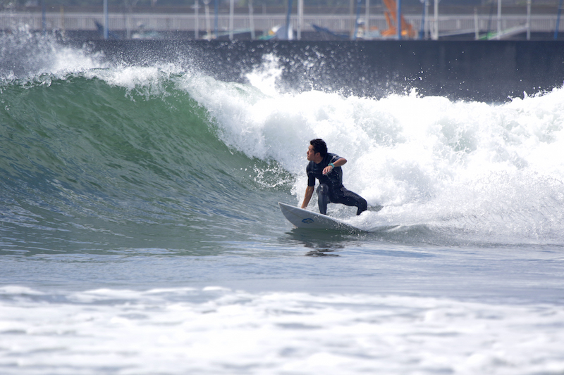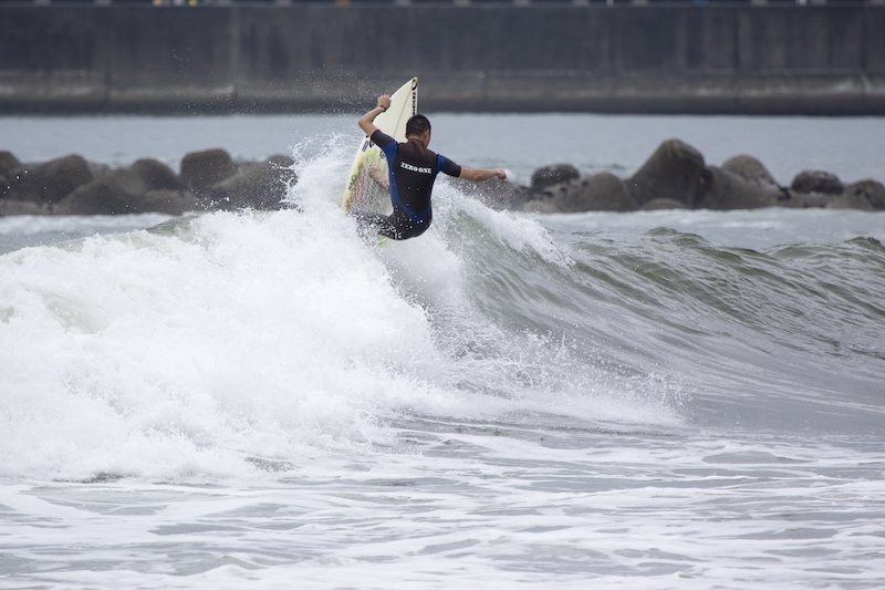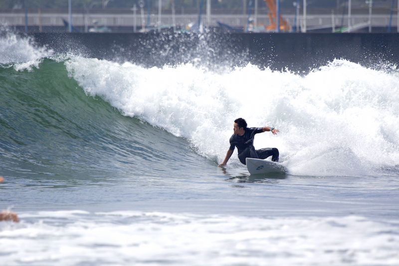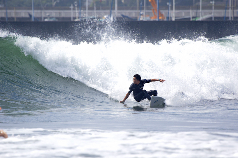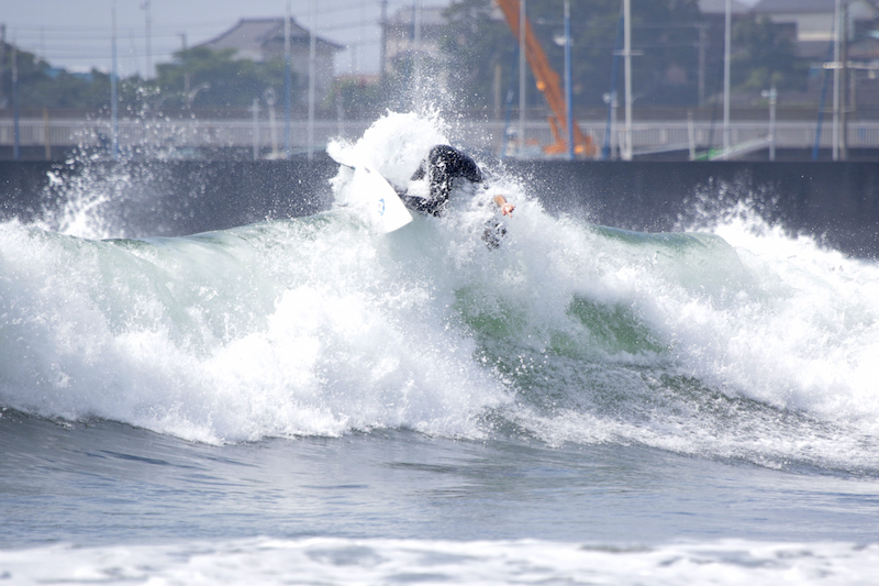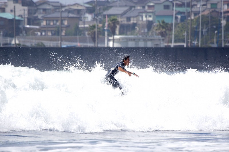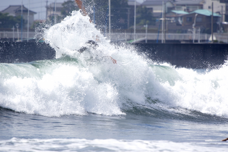 The boys in Kamogawa are warming up for a long pulse of solid surf forecasted for the next few days. The park at Seaside is the best place to be these days and different tides allow for different sand banks to work. Hideto Ozawa has good timing on his day off and smashes the wall. This is his second round surfing.