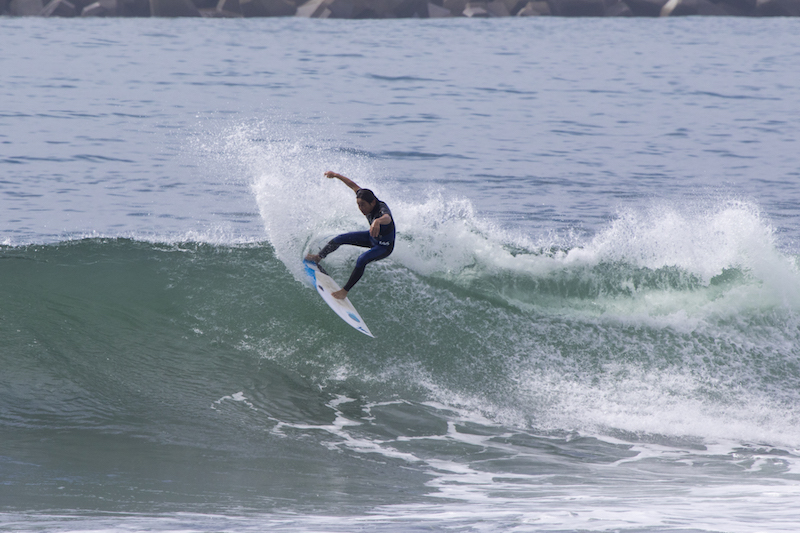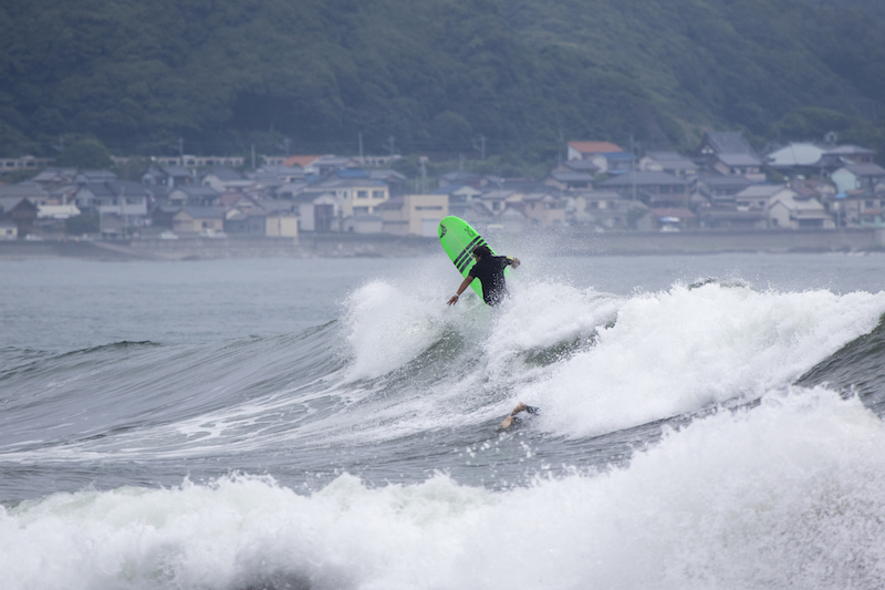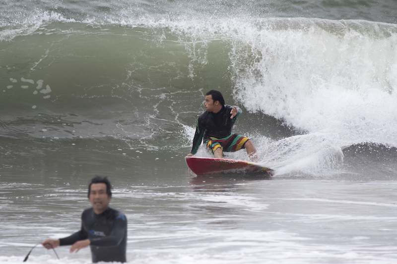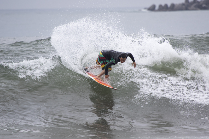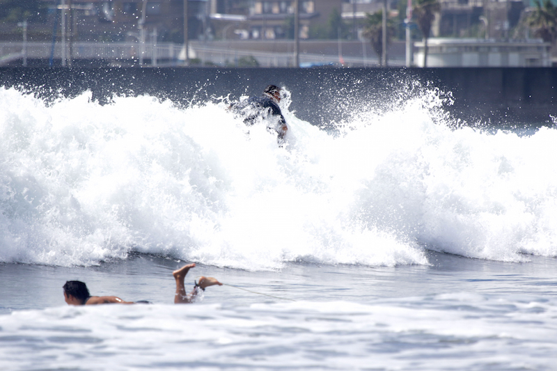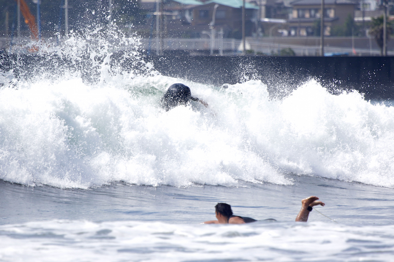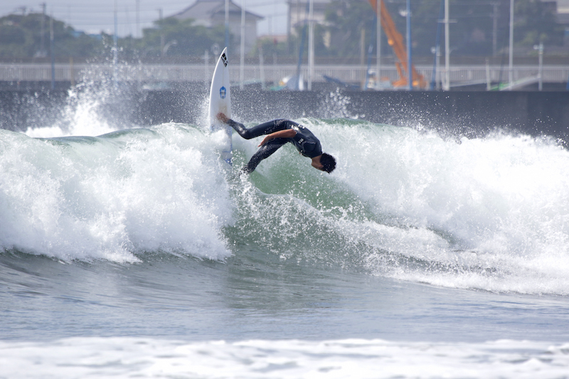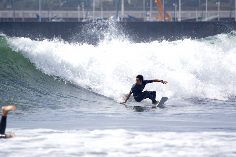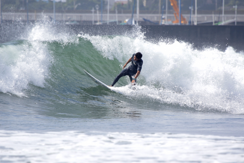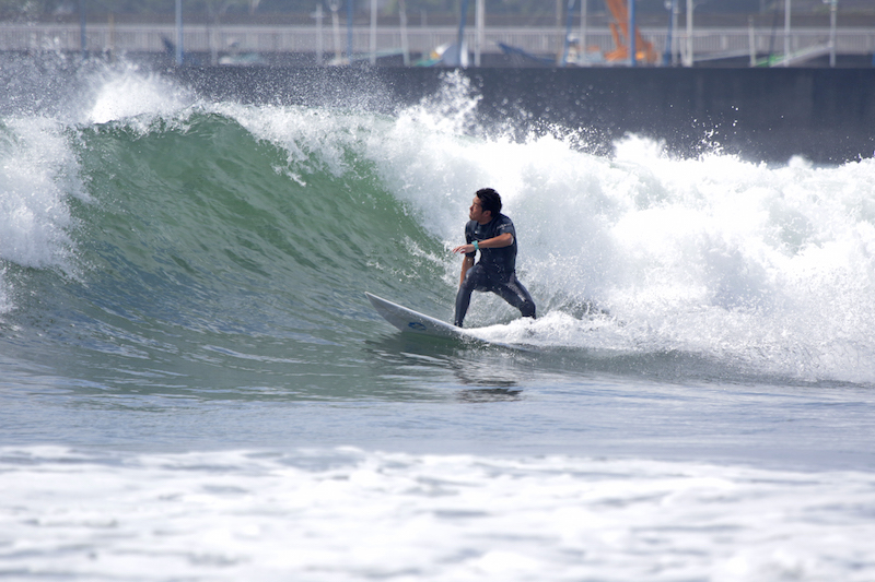 The boys in Kamogawa are warming up for a long pulse of solid surf forecasted for the next few days. The park at Seaside is the best place to be these days and different tides allow for different sand banks to work. Hideto Ozawa has good timing on his day off and smashes the wall. This is his second round surfing.