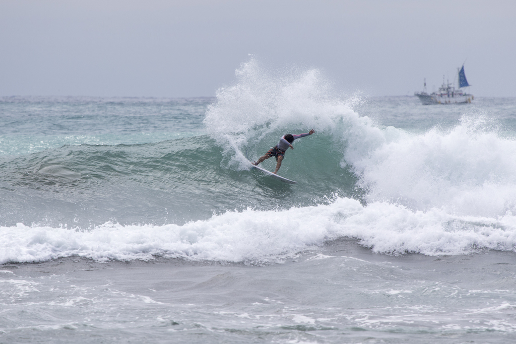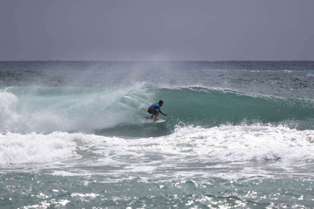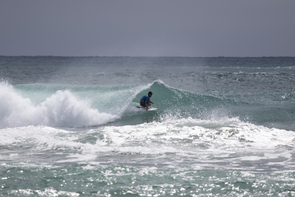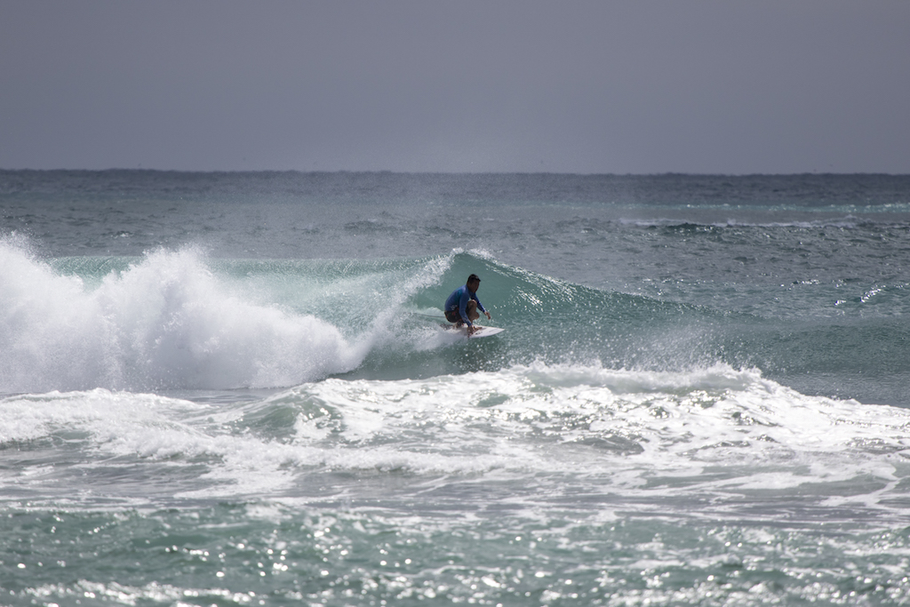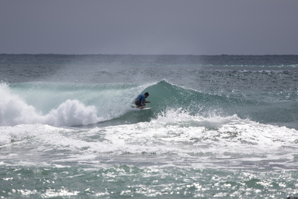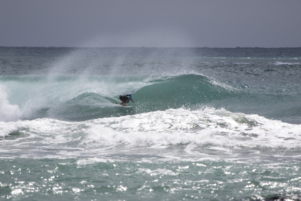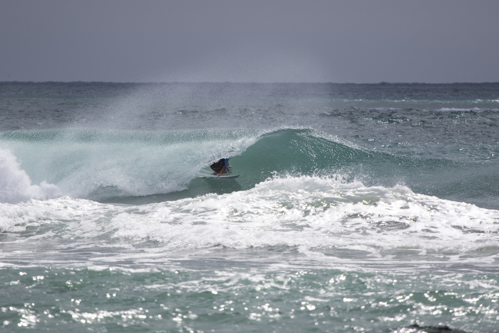 The offshore winds were stiff and offering up some barrel time on the shallow lefts. Naohisa Ogawa heads for some shade time.
