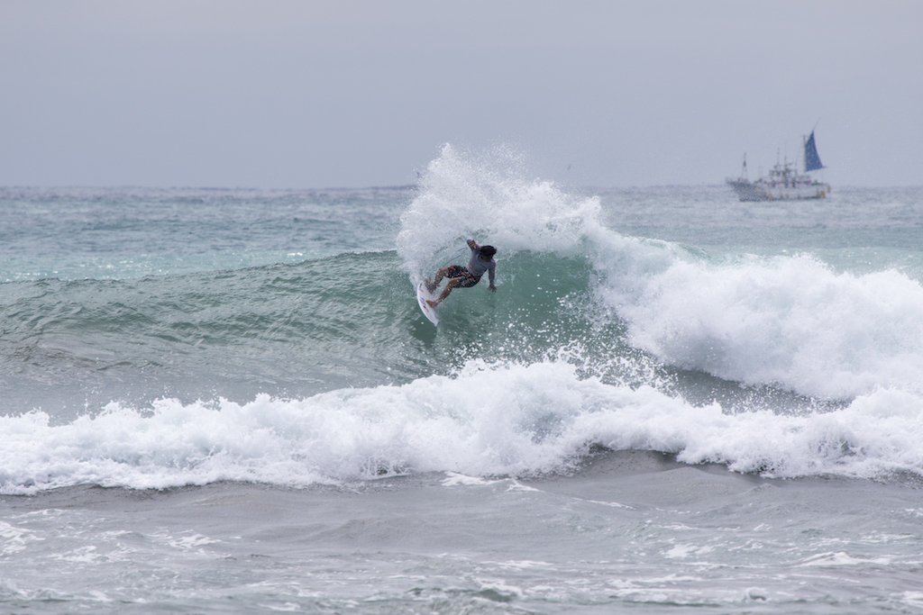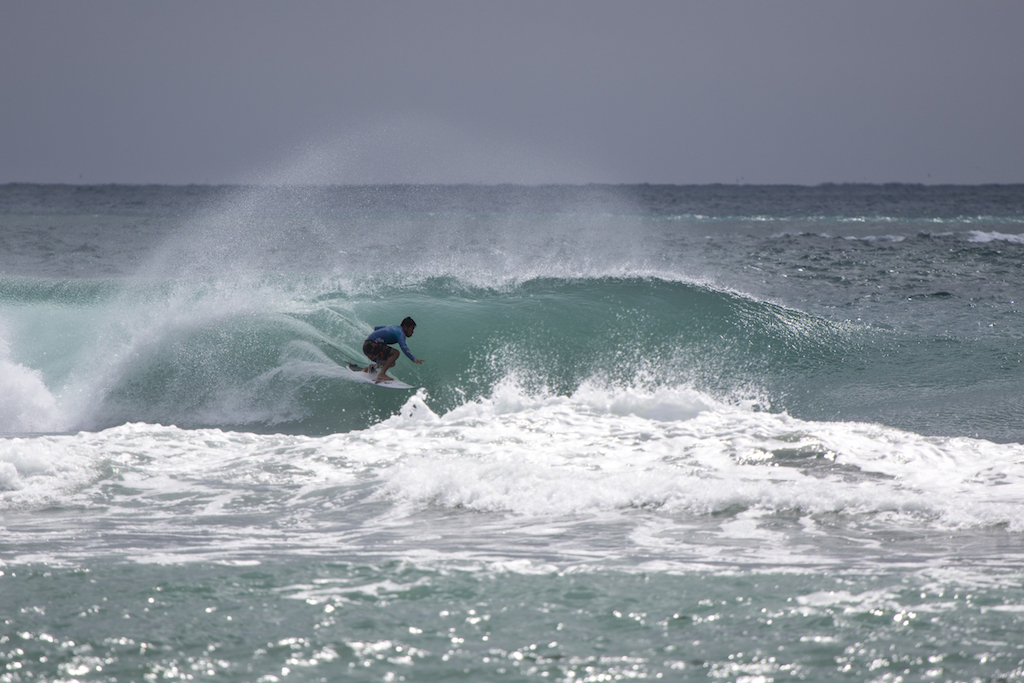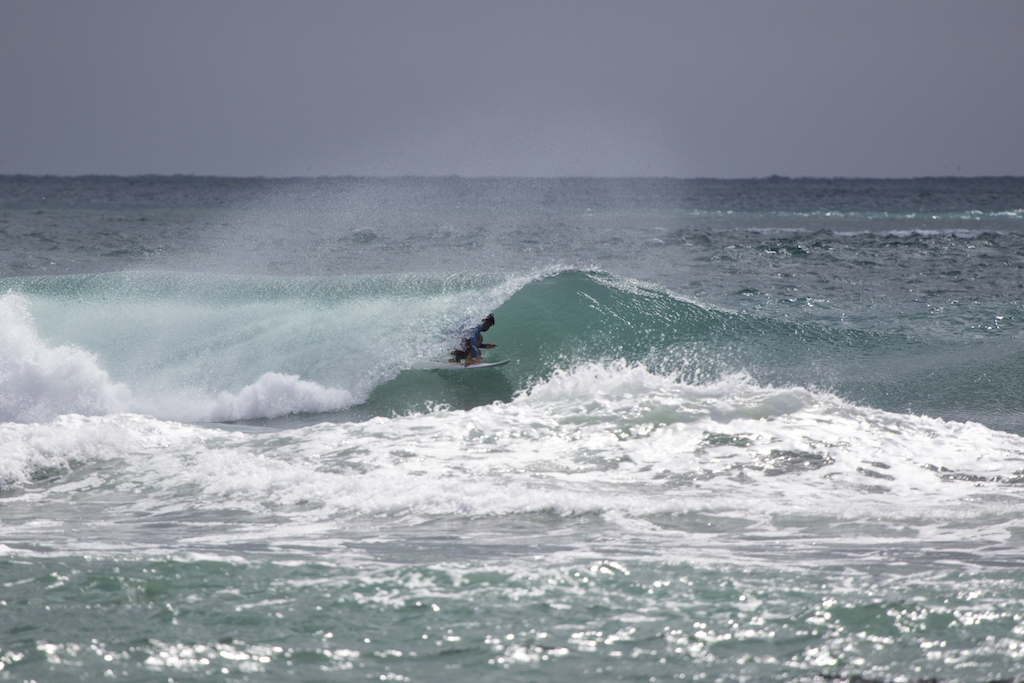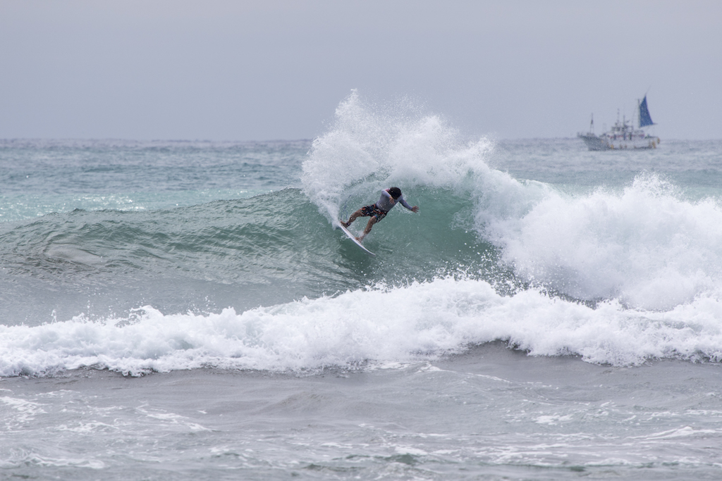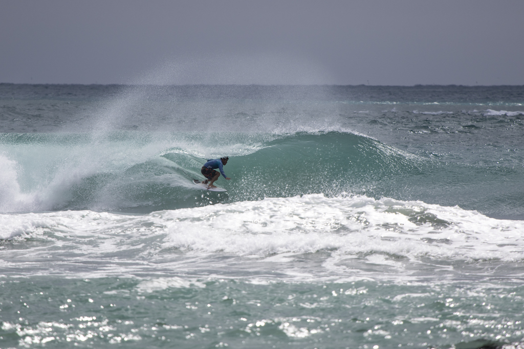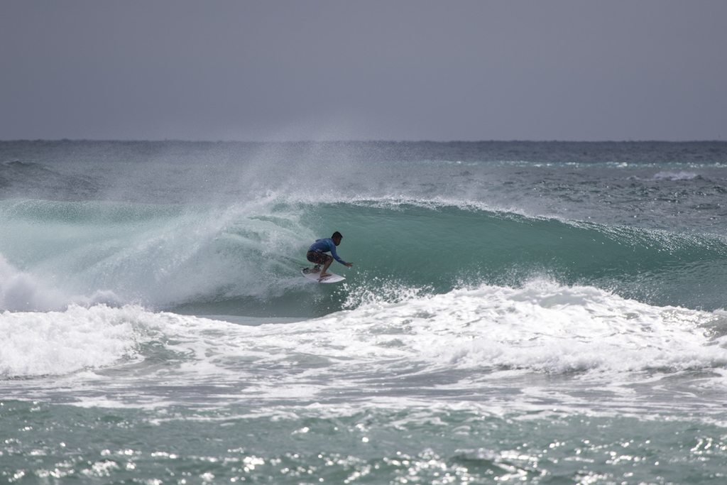 The offshore winds were stiff and offering up some barrel time on the shallow lefts. Naohisa Ogawa heads for some shade time.