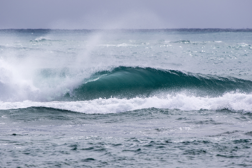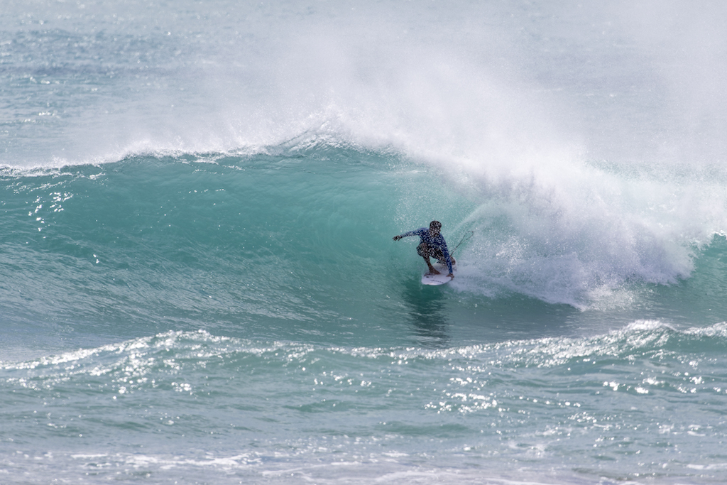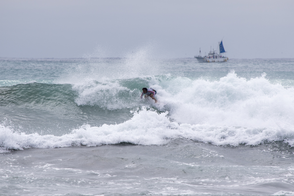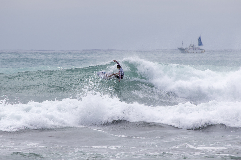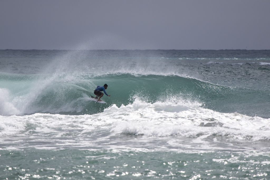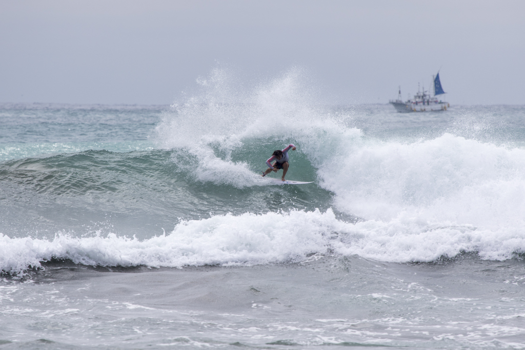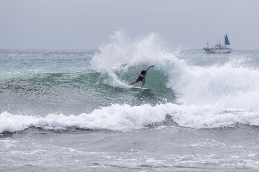 The offshore winds were stiff and offering up some barrel time on the shallow lefts. Naohisa Ogawa heads for some shade time.