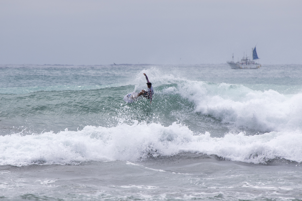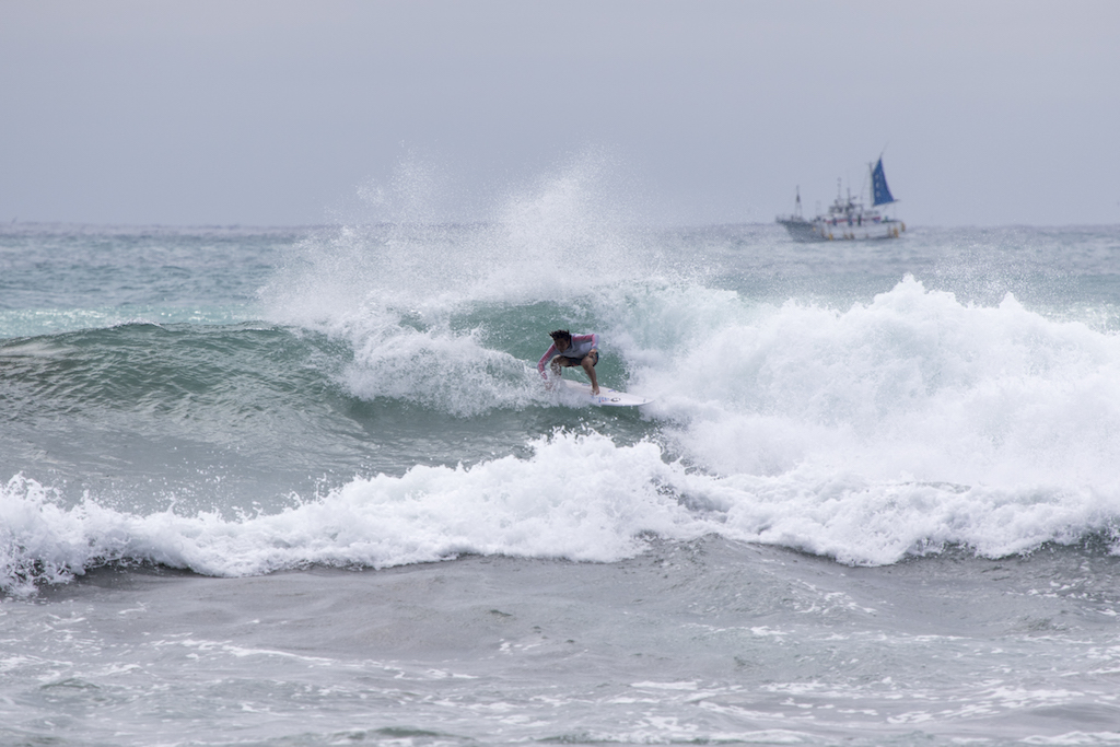 このセッションが終了する間際にレギュラーの波にトライした小川直久。