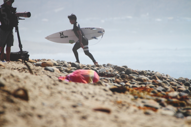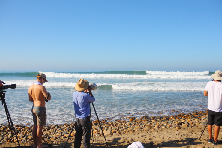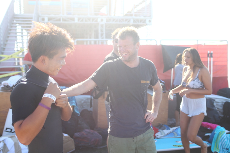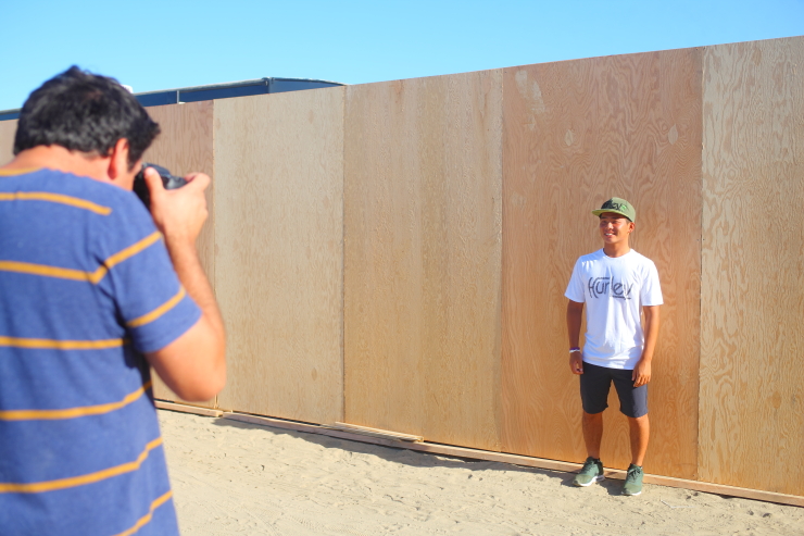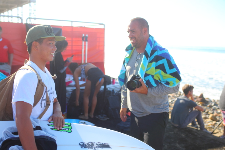 ビーチに降り立つと、元プロサーファーで現在は一流のサーフィン・ジャーナリストとして活躍するPeter Kingに遭遇。早速Peterによる動画撮影とインタビューが始まり、そうこうしていると米SURFING誌のカメラマンにポートレイト撮影を依頼されたかと思えば、さらにはオーストラリア出身のTaj Burrow、今大会のラウンド1の対戦相手である3×ワールドチャンプのMick Fanningなど、多くの世界のトップサーファーたちからも声をかけられ、世界の舞台に溶け込んでいる姿が印象的であった。