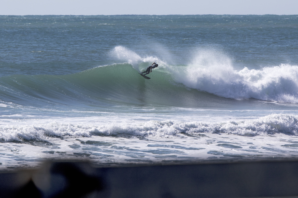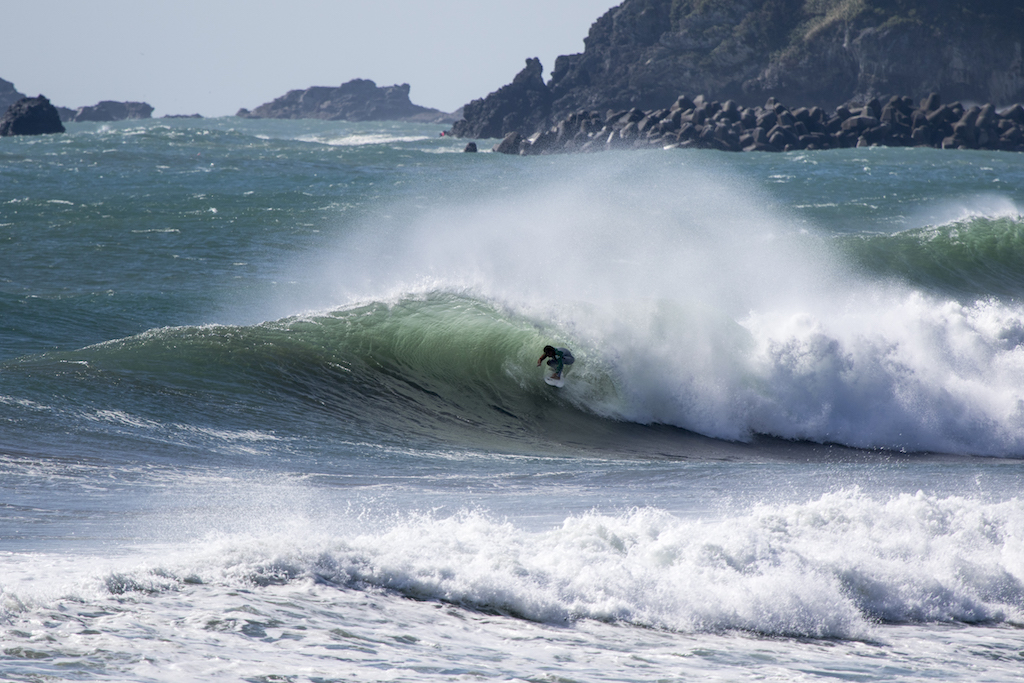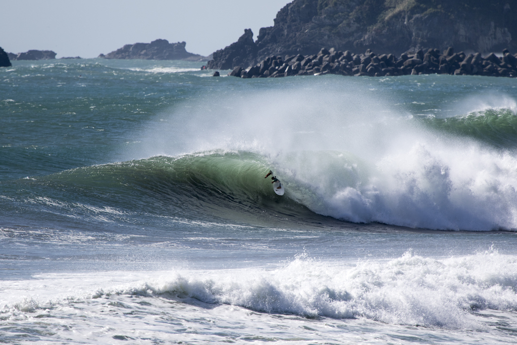 Steep and late take offs were needed against the strong winds and Yukio gets the wave of T23. A deep frontside barrel.