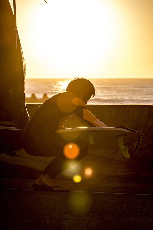 Grace surfboards owner/shaper, Taro Taniuchi gets wet before heading into the shaping room for the day. To be able to stay in tune with surfboard design and new concepts, Taro spends a lot of time doing research and development.
