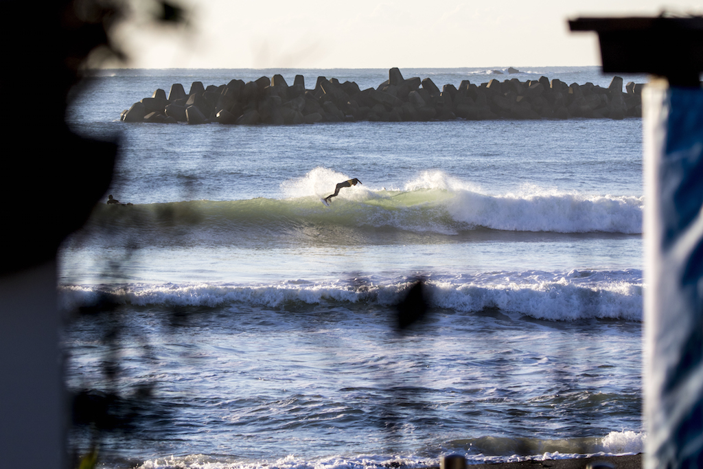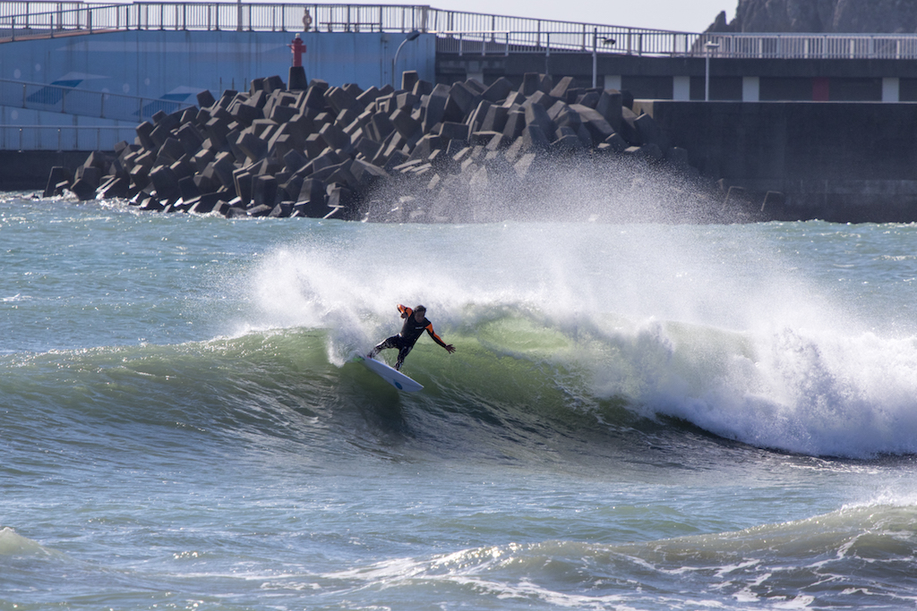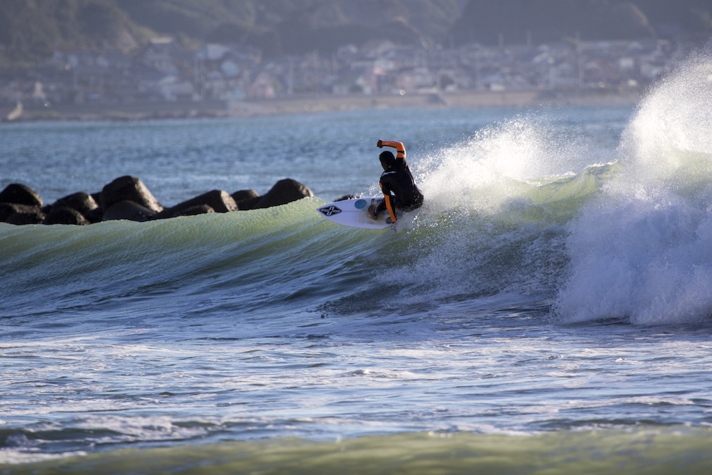 Hanging out in Kamogawa for a few weeks, the Okinawa Shisa, Rikio Higa waxes up for an early morning session. Veteran surfing skills put him in the right place at the right time.