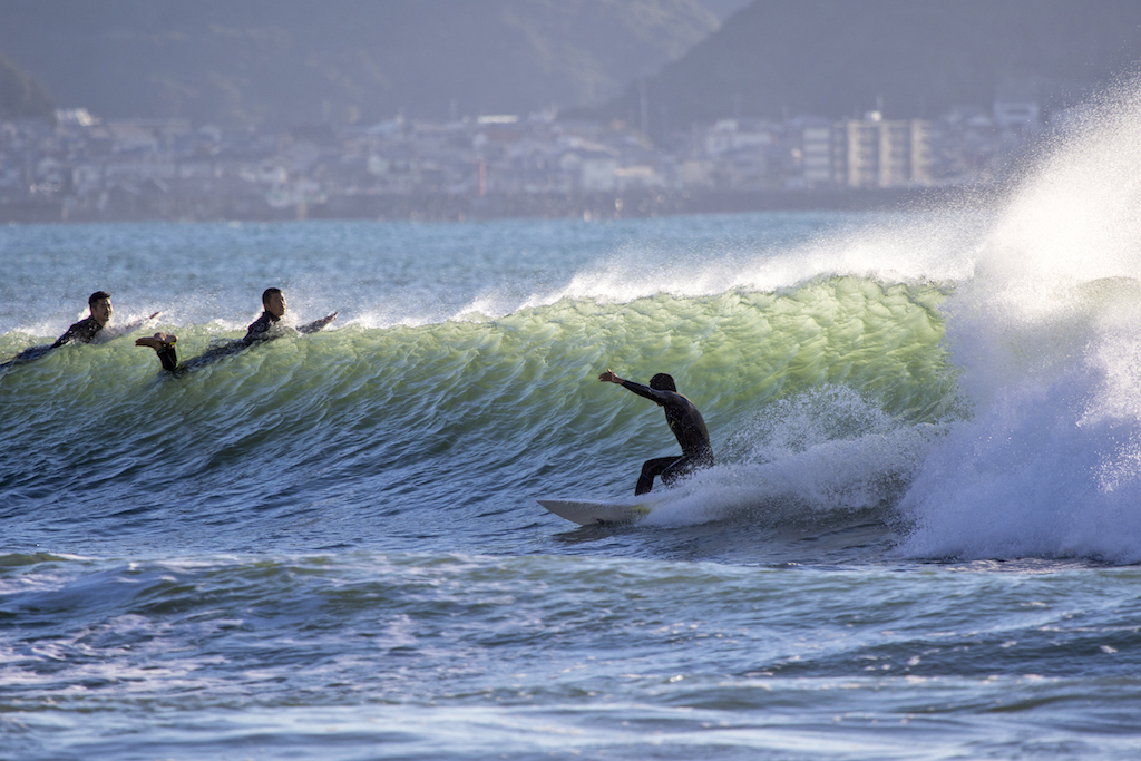 Day 1. Yukio Ogawa, Yuji Waki, and Masashi Uno try their luck at a shifty sandbar somewhere in between the main breaks of Kamogawa.
