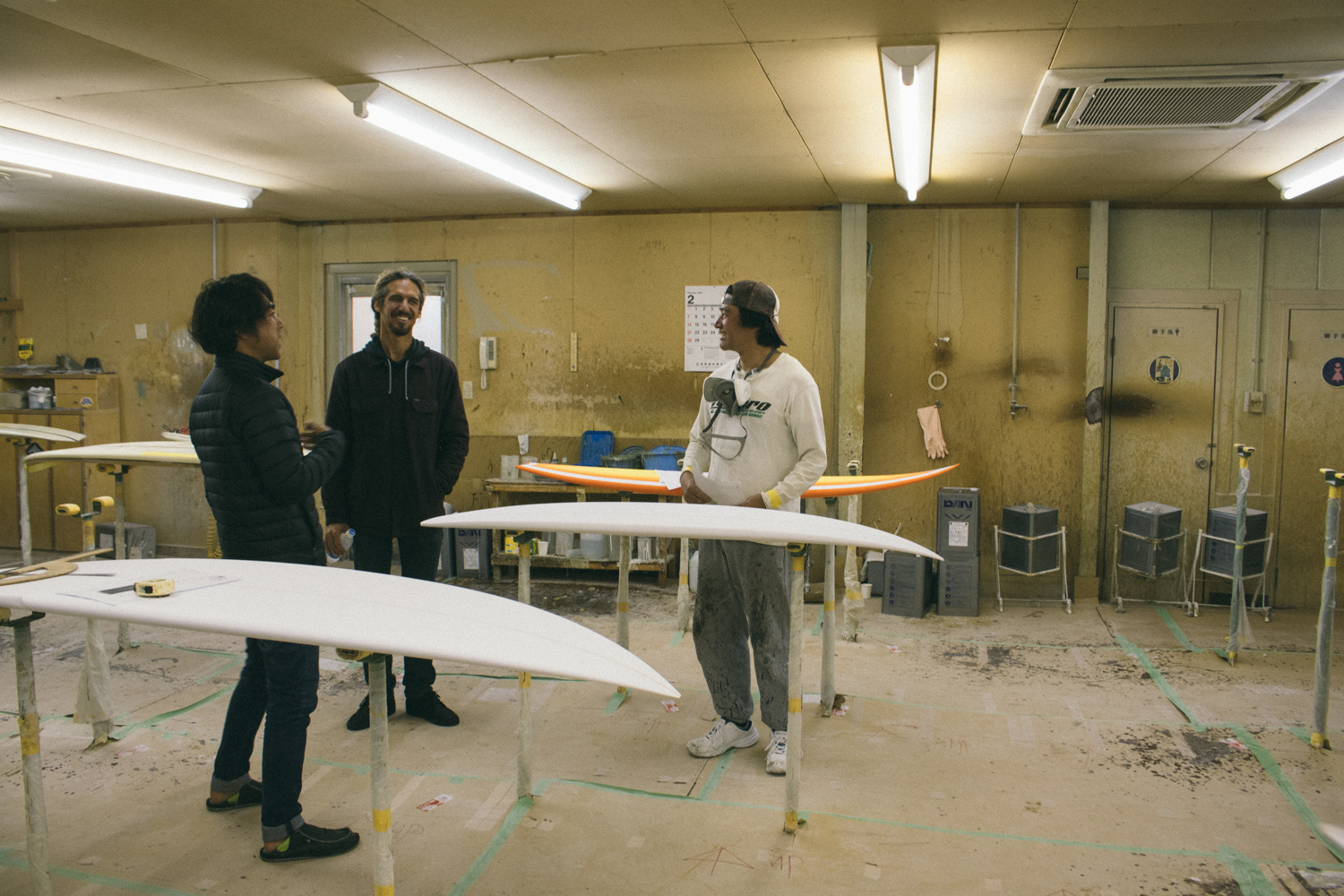 通称”世界のユウリくん”と共にサーフボードシェイプ談義に花を咲かせつつ、