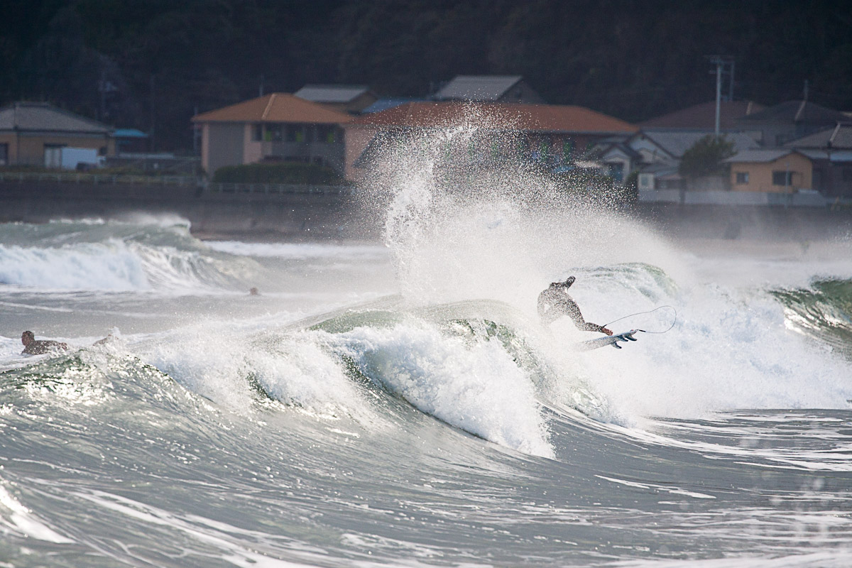 波頭から飛翔する大原洋人。