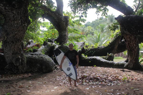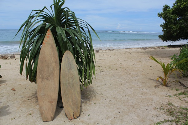 これは木でつくられた板の一例。1枚はフィンレス、もう1枚は木を削ったサーフボードにコーラのフタとタイアのチューブ、ヒモを組み合わせたリーシュと木にめり込ませたフィンのチューニング。こんな道具でも彼らはチューブライディングをメイクするというから、フォームの種類だの何インチの長さだのってのを気にしてることに、必要性があるのかを思わず考えてしまった。。。