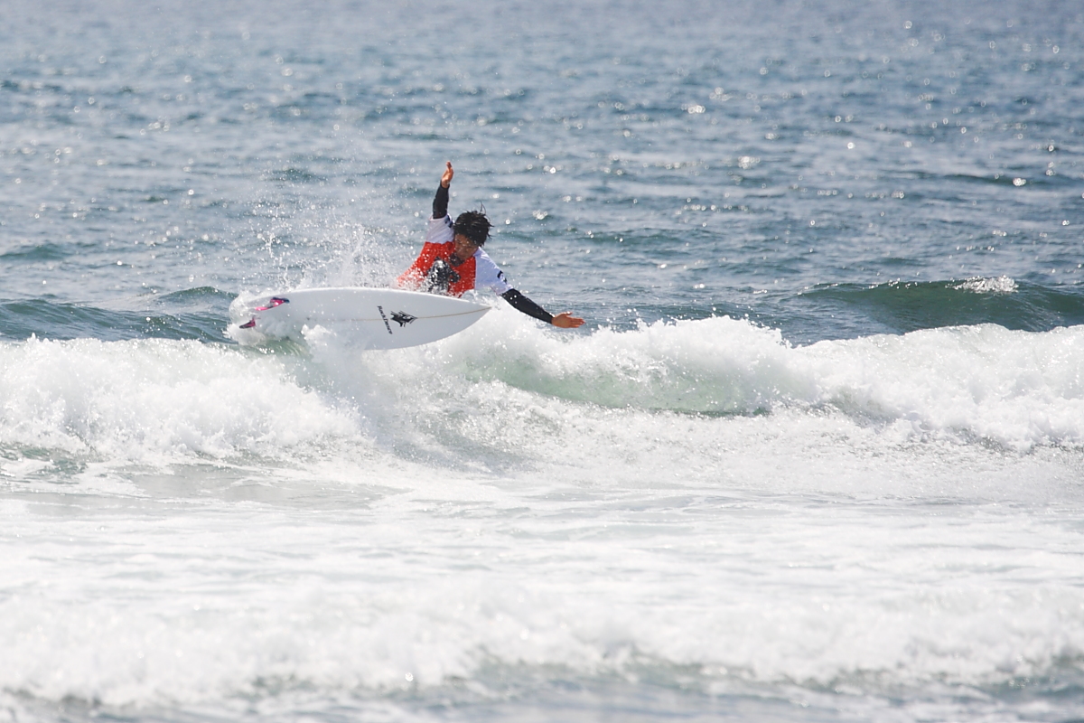 Cadetクラスのなかではかなり年下の立場であるにも関わらず、ヒート開始早々ショルダーが伸びていくグーフィーの波を掴み、そのままリズムよくクォーターファイナル進出を果たした伊東李安琉。Riaru Ito.