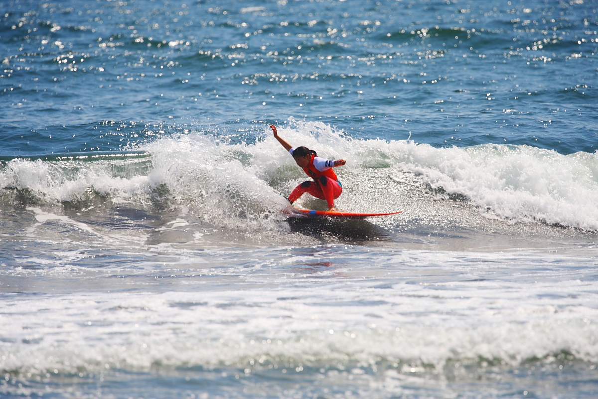 女の子サーファーであるにも関わらず男子に混ざってGrommetクラスに出場し、ラウンド1のヒート2ではダントツのサーフィンを見せて見事1位通過を果たした中塩カナ。Kana Nakashio.