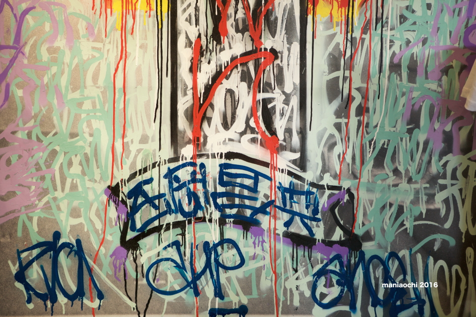 そしてさらに話題となるのがRVCAがリコメンドする注目のフランスはビアリッツ出身のアーティストでありサーファーでもあるマルゴー アーハモン テユコがGREENROOM FESTIVALでペイントしたアート作品や以前にもCOLORS Magで取り上げられたGREEN ROOM FES、RVCAブースに展示されていた巨匠、横山 泰介氏によって撮影された故.デビル西岡氏こと西岡 昌典氏のポートレイトをキャンバスにKvien AncellによってDOGTOWNライブペイントで塗り尽くされたデビル西岡氏の生き様、人生そのものといっても過言ではない超大作アートが店内に展示されており関西人にとってなかなか横浜GREEN ROOM FESに足を運べないがゆえにこのアート作品をリアルに大阪で体感できるBlue in Greenならではの他にはないかなりマニアな1周年記念フェアとなっている。