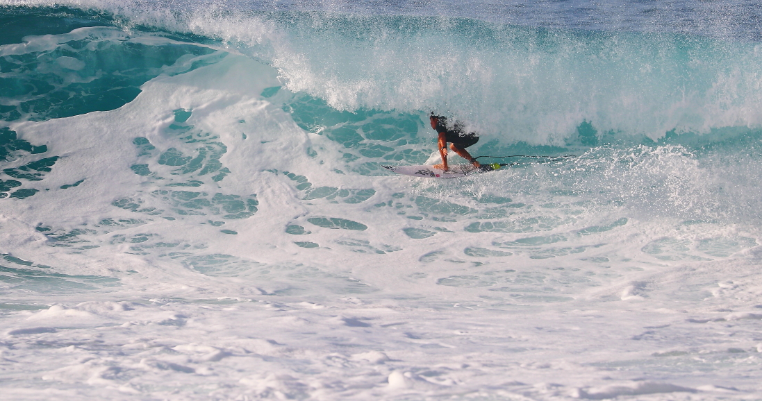 1/18にパイプで顔面をリーフにヒットさせて怪我を負っていたことから一度治療のため帰国していたが、再びハワイへ舞い戻り、1発目のセッションでこの波であろうとも怖気付くことなくチャージするのはさすが。
