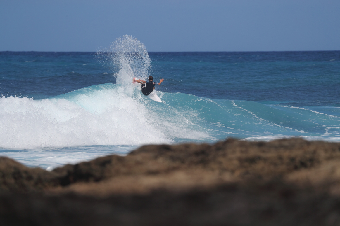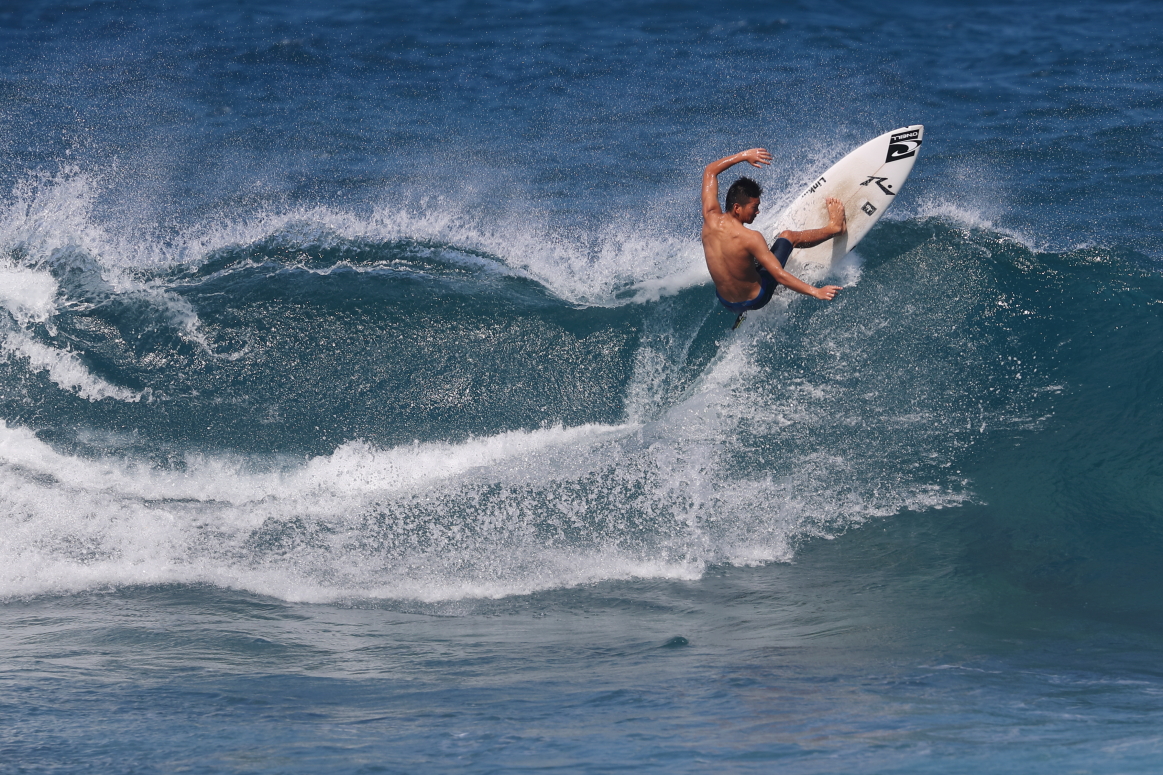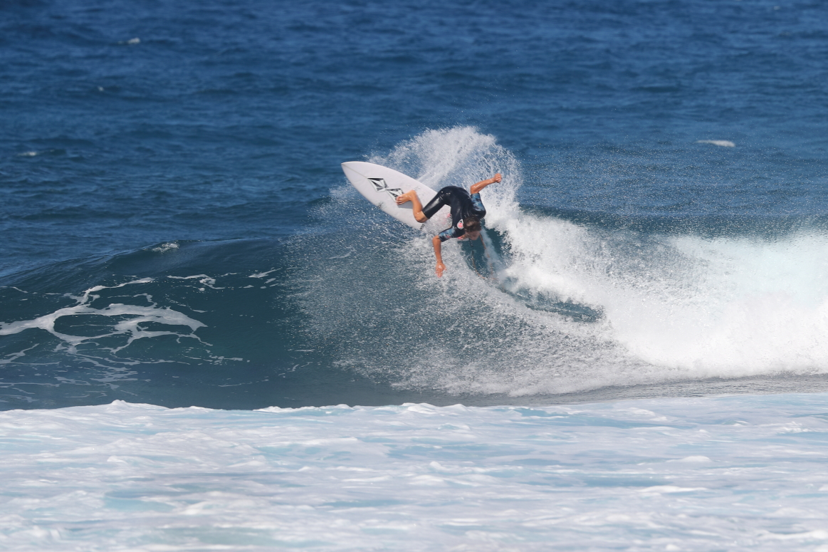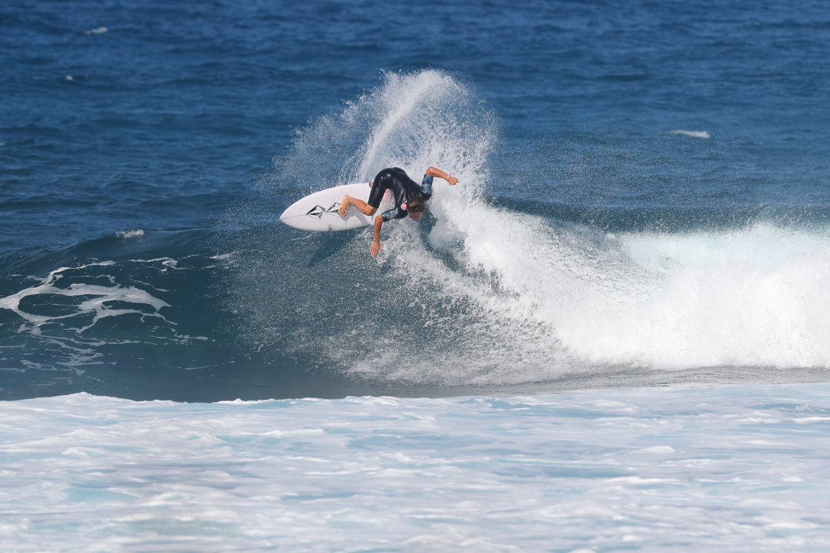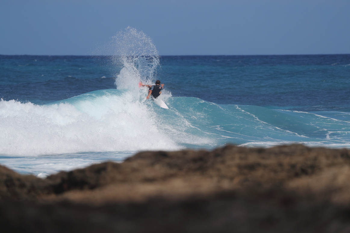 昨シーズン、ポルトガルで行われたISAワールドジュニアの大会中に負った足の怪我もだいぶよくなり、ハワイでは調整を兼ねて徐々にサーフィンしているようだが、見ている感じここロッキーでのアクションだけでなく、パイプ、バックドア、オフザウォールでのチューブ・パフォーマンスにおいても流石なライディングを見せてくれる西慶次郎。