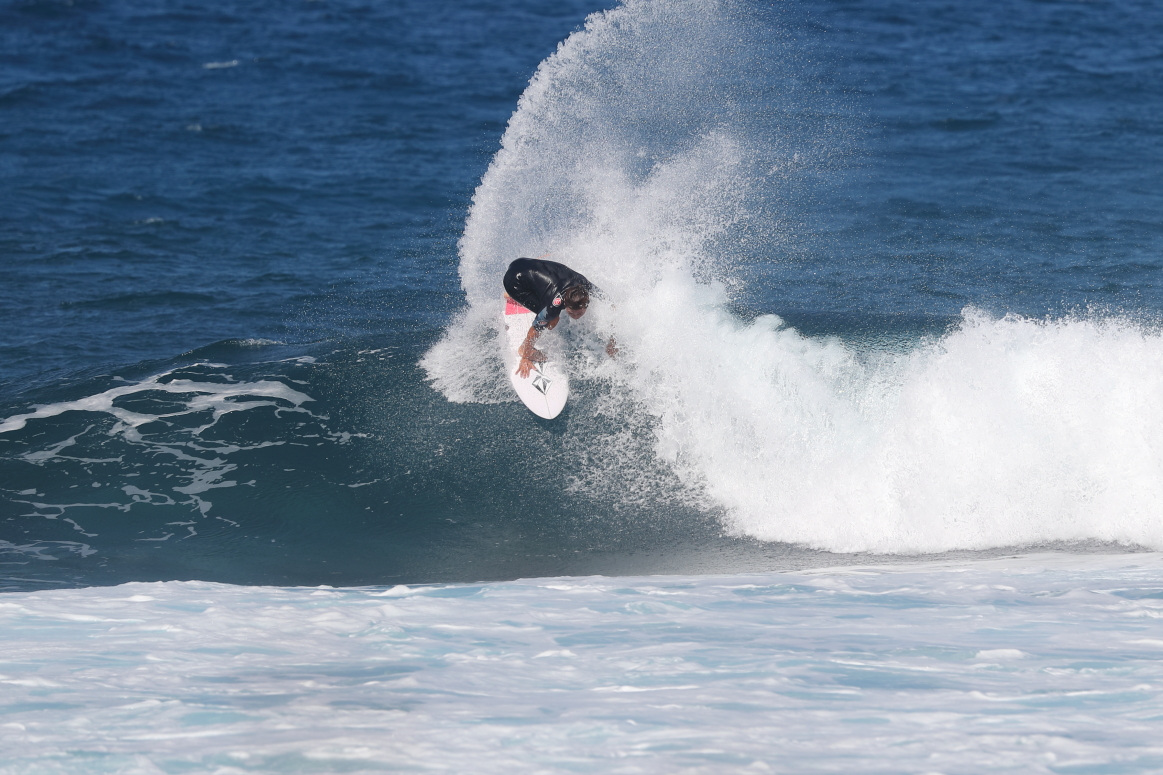 このセッションでは深いボトムターンからソリッドなバックサイド・リッピングを連発し、そのサーフィンがさらに進化していることを痛感させられた。