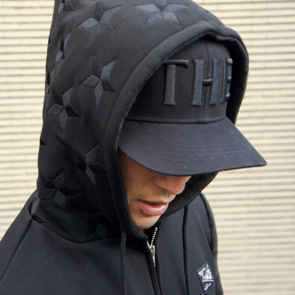 フード全体とパンツのサイドラインに施された、スター刺繍が目を引くデザインに、パンツはすっきりとした、細身なアウトラインになっているため、上下別々にコーディネートすることも可能なのが73Rのセットアップのポイント。