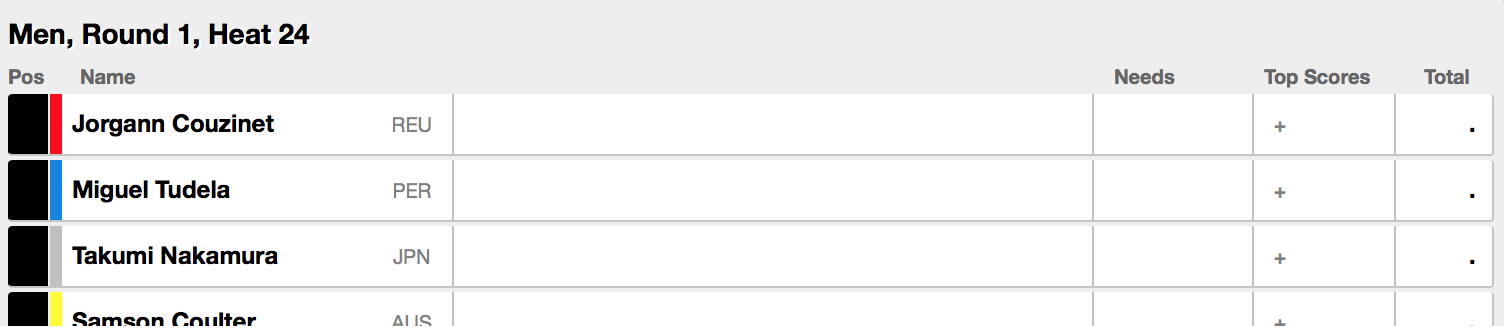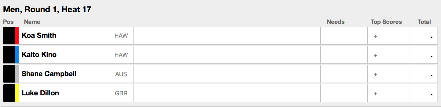 続くヒート17では日本人ハワイアン喜納海人がKoa Smith(HAW)、Shane Campbell(AUS)、Luke Dillon(GBR)と対戦予定。