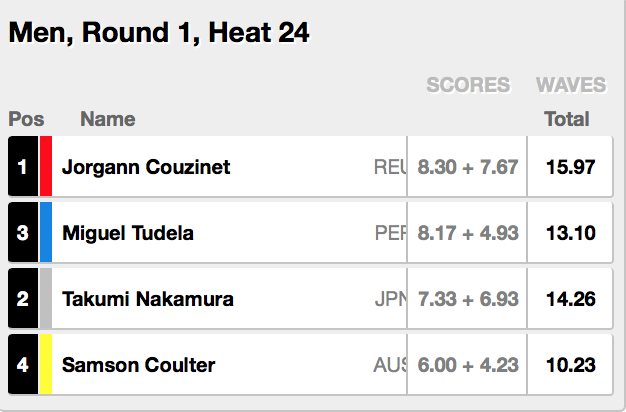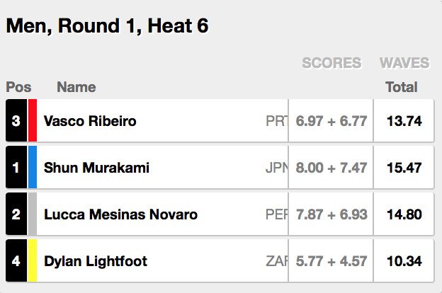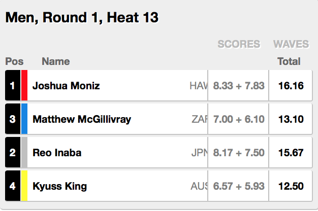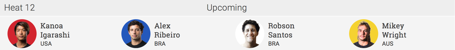 トップシードを持つカノア五十嵐は、ヒート12でAlex Ribeiro(BRA)、Robson Santos(BRA)、Mikey Wright(AUS)と対戦。
