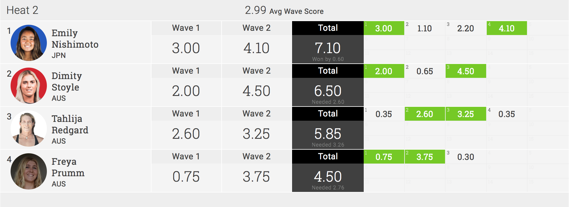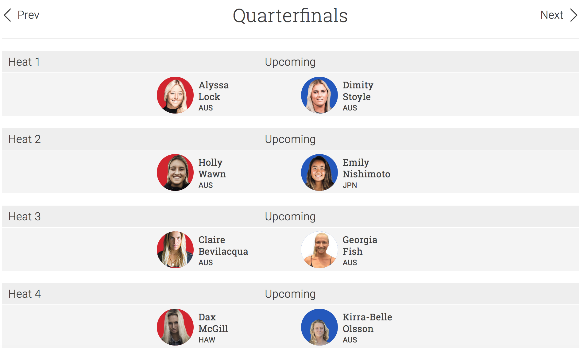西本エミリーはクォーターファイナルのヒート2でHolly Wawn(AUS)と対戦予定となっている。