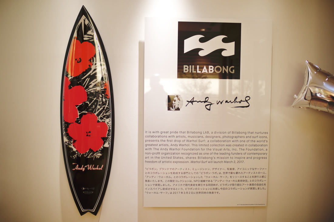 日本では3/2(木)19:00より、ロンハーマン千駄ヶ谷を会場にリリースイベントが行われ、会場にはAndy Warholによるアートが施された最新BILLABONGアイテムがラインナップされ、会場に訪れた多くの人たちの目を釘付けにしていた。